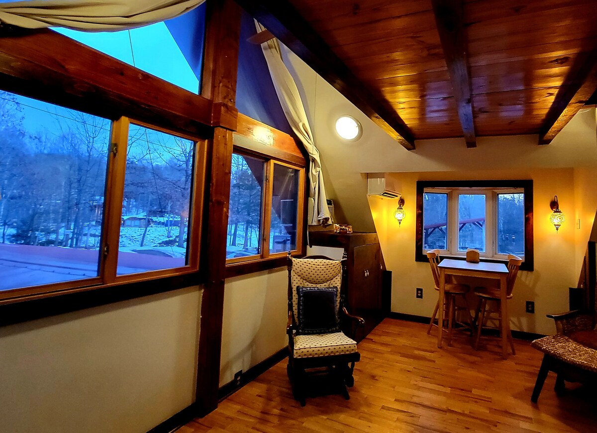 Is é Cabernet Chalet an áit fhoirfe chun éalú ó gach rud, ach níl sé ach 10 míle ó Fhíonghoirt Luath Sléibhe. Neadaithe ar an sliabh gheobhaidh tú suaimhneas timpeallaithe ag crainn agus an t - aol sléibhe. Téigh ar maos i bhfolcadán na gcos claw, léigh sa phóirse scagtha, lig do scíth sa sabhna tar éis lá fánaíochta, agus imir cluichí boird sa scioból fíona. S'mores rósta thar an tine lasmuigh nó sip fíon ar an deic in aice leis an mbord dóiteáin. Bí réidh le sult a bhaint as an dúlra faoi shó!
