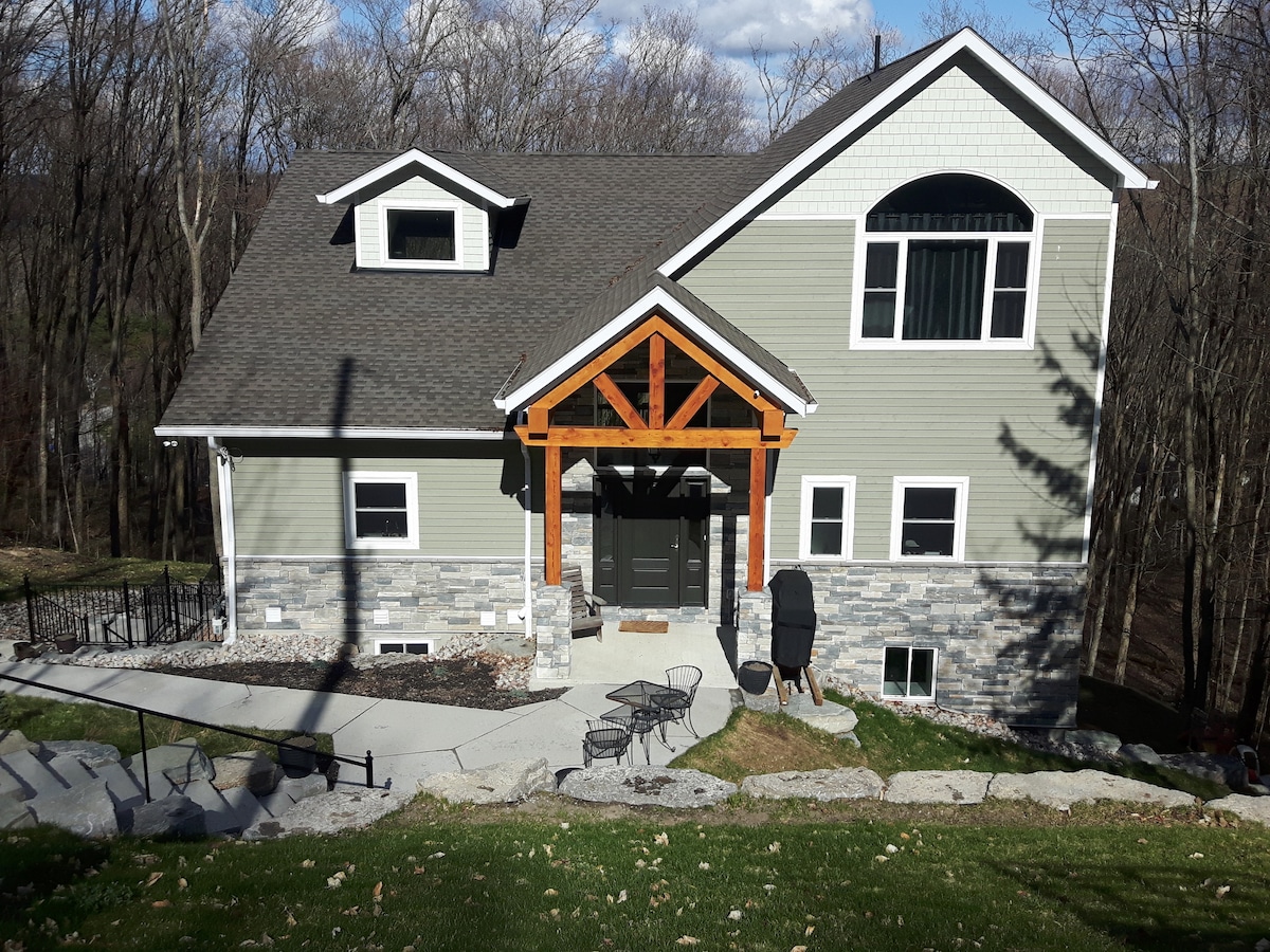 LÉIGH LE DO THOIL! Mt. St. Louis & Horseshoe Valley ar leac an dorais! Is svuít gheal, mhór phríobháideach siúil amach (árasán íoslaigh) é seo. Tobán te, paitió, poll dóiteáin & cosán cúlráideach sa choill chun taitneamh a bhaint as an dúlra. Tá cistin feistithe le barr cócaireachta ionduchtaithe agus gach rud is gá, fiú osclóir buidéal fíona:) Oscail seomra suí/cistin/seomra bia le teilifís & Roku. Is saothar Ealaíne é an seomra leapa: dorcha, mistéireach agus rómánsúil! Leaba na Banríona saincheaptha déanta as adhmad sciobóil síonchaite ónár réadmhaoin.