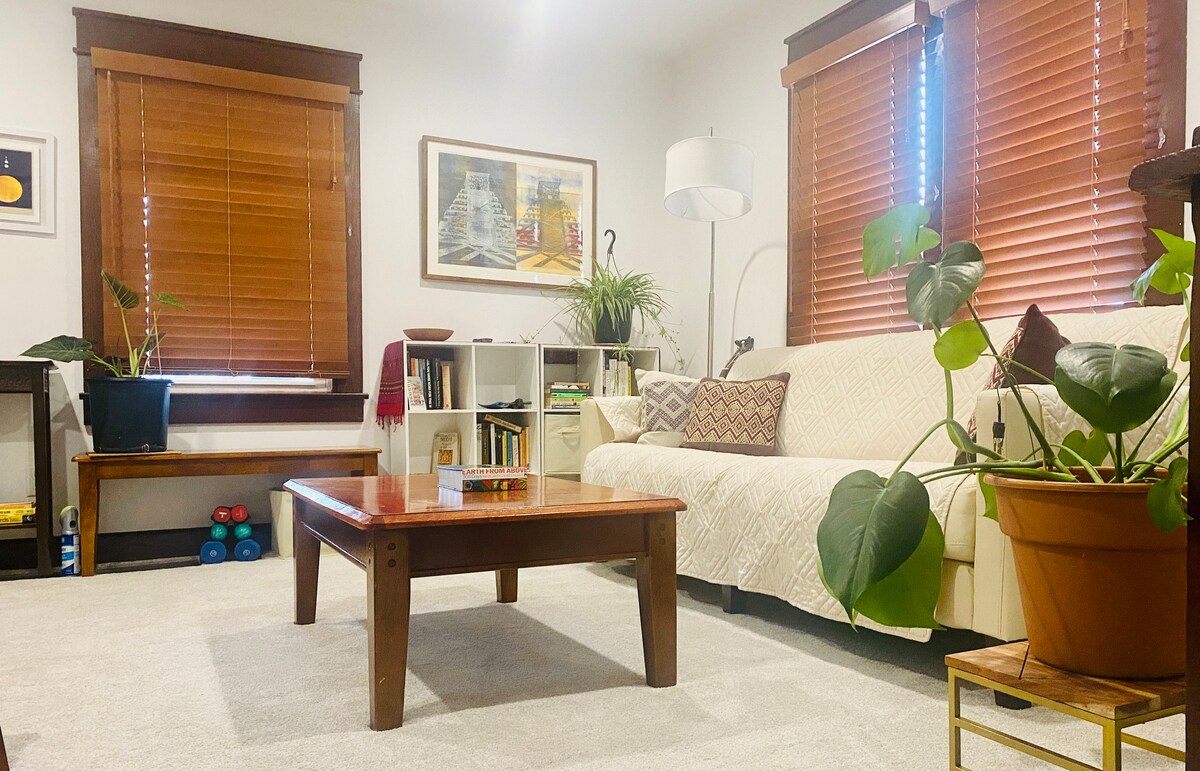 Ealaín agus leabhar líonta. Tá sé suite in Bloomington Indiana. I mo bhungaló sna 1920idí tá dhá sheomra leapa d'aíonna le leapacha ar mhéid na banríona, cuilteanna síos, piliúir chleite/síos, cuirtíní líne agus seomra folctha príobháideach. Tá póirse gairdín, bealach isteach príobháideach, seomra suí agus, áit itheacháin ina bhfuil micreathonnán, cuisneoir beag agus tábla mailpe lámhdhéanta san áit d'aíonna freisin. Níl CISTIN ann. Tá an seomra folctha idir na seomraí leapa agus tá bidet níocháin Toto agus earraí níocháin EO ann.
