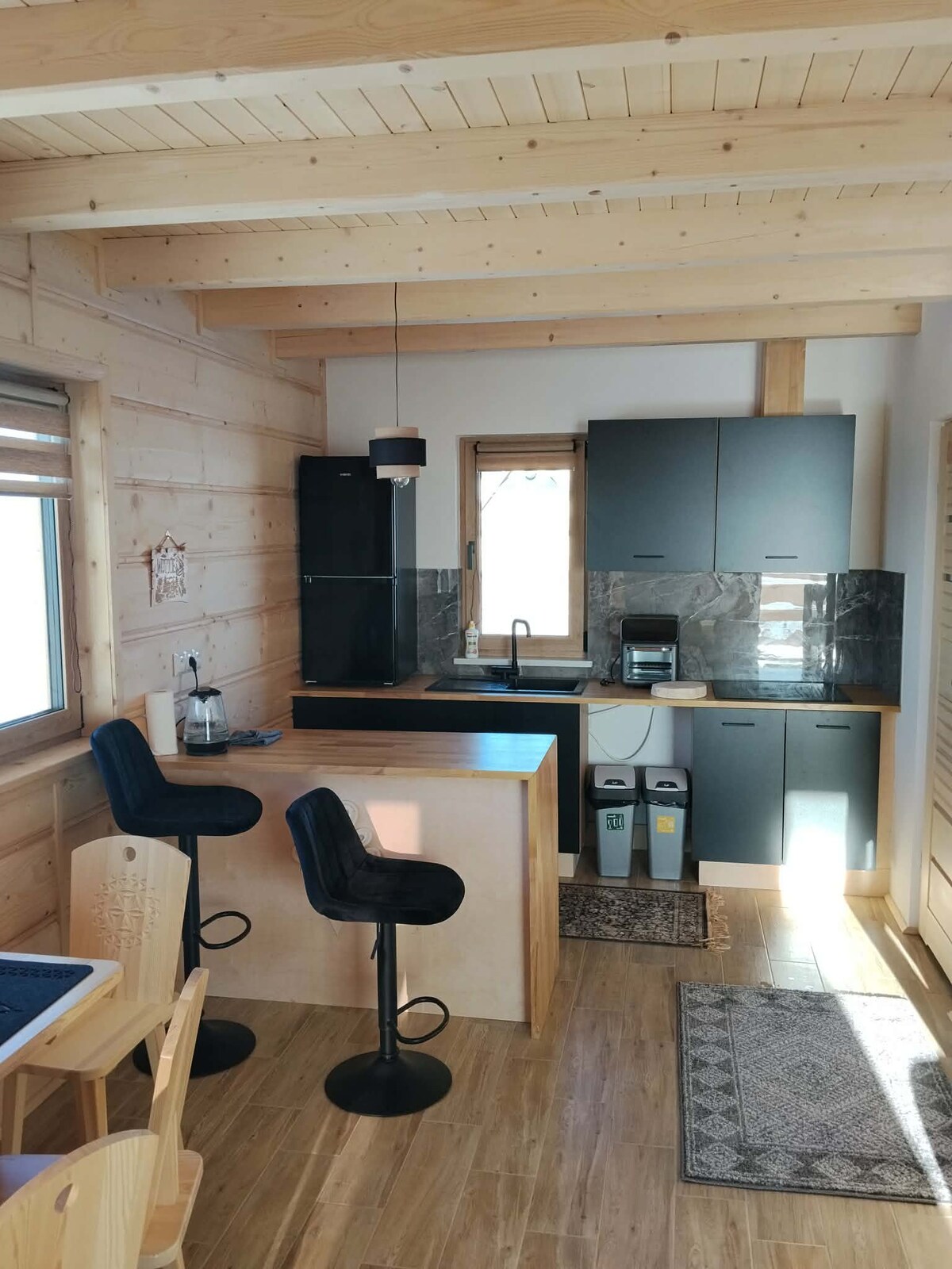 Branda nua tógtha in 2019! Táimid lonnaithe I mbaile beag feirmeoireachta ciúin Gronkow. Níl Bialka Tatrzanska ach 7km ónár gCábán, áit ar féidir leat taithí a fháil ar chuid de na sciáil is fearr atá le tairiscint ag an bPolainn. Tá ár gcábán suite i bpáirceanna oscailte Gronkow. Radhairc iontacha ar shléibhte Tatra ó dheas agus ar shléibhte Gorce ó thuaidh. Téigh ar thuras ar an gconair rothar nua atá 90 méadar ón gcábán agus cíos rothar Mon Velo atá díreach ar an réadmhaoin. Faigheann aíonna cábáin lascaine 15% ar gach cíos