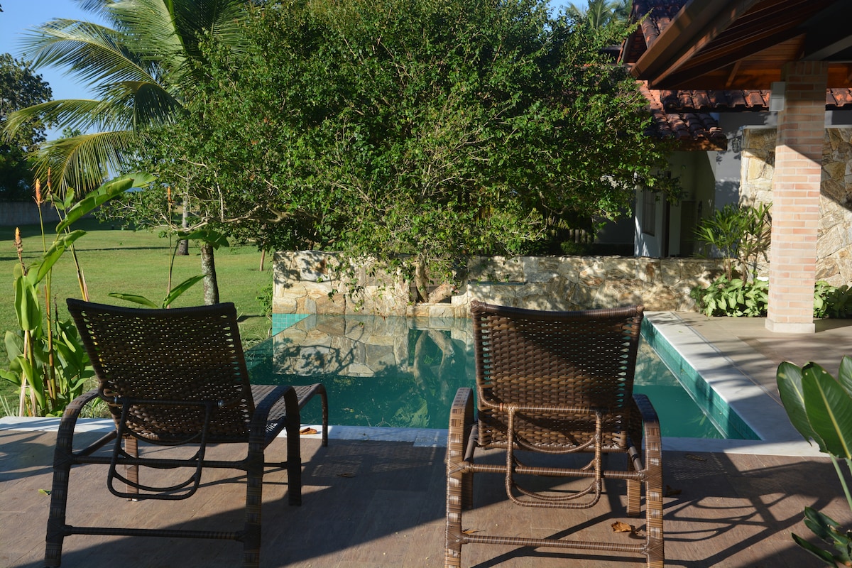 Casa germinada reformada em condomínio fechado, linda e espaçosa área verde, 2 vagas garagem, piscina, filtro, à 50 m da praia. Serve 8 pessoas, possui 2 suítes c camas queen e home office, 1 quarto c cama queen e home office, 1 quarto c cama de casal e 1 de solteiro; 1 banheiro e 1 lavabo. Tb uma confortável área de churrasqueira. Cozinha e sala c ventiladores. Quartos c AC e colchões novos. Roupas de cama. Utensílios de cozinha e equipamentos , TV 58", Internet rápida, equipamentos de praia.