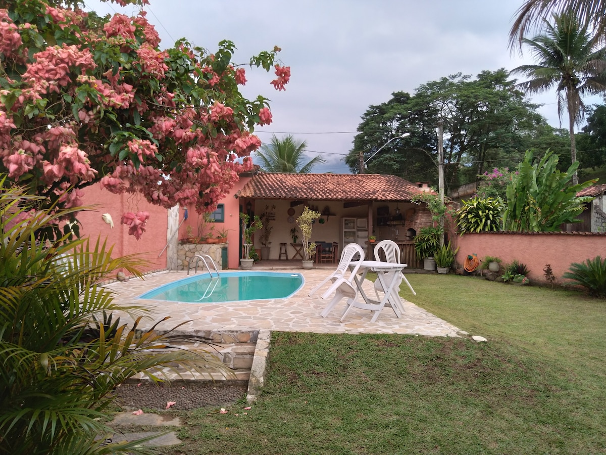 Aproveite esse pedacinho do céu na cidade de Guapimirim, a menos de 1 hora do Rio de Janeiro. Casa integrada a natureza, com espaço para home office, diversão das crianças e lazer dos país, (temos wi-fi, tv e smart tv com funcionalidades para internet) Para curtir o friozinho temos piscina aquecida, fogão a lenha, forno de pizza e panelas de fondue. Quartos com ar condicionado e ventilador de teto para o verão.