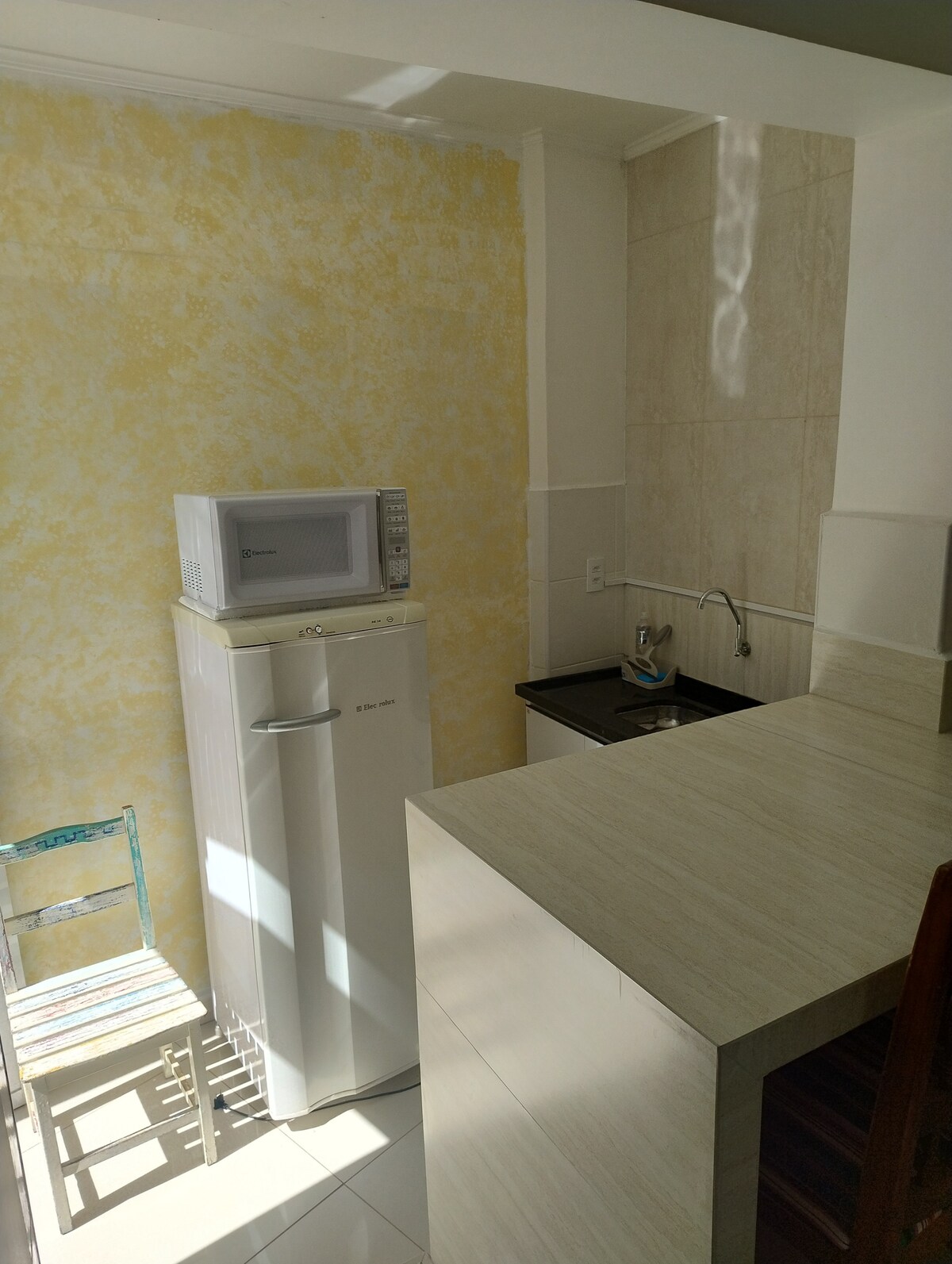 Tá an lóistín i bpríomhcheantar den chathair, tógáil nua agus rochtain éasca ar bheáir, ar bhialanna, ar ollmhargaí, ar bhácúis... Tá an chomharsanacht gar don lár, agus cúpla bloc ó FDF agus UNIFACEF. Is spás dlúth é ina bhfuil seomra, seomra folctha agus micrea - chistin. Tá micreathonnán, citeal leictreach, sorn dhá ghiotán leictreach, cuisneoir, doirteal le cófra agus uirlisí tí ann. Cuirim in iúl freisin go roinntear an áit lasmuigh ina bhfuil níochán.