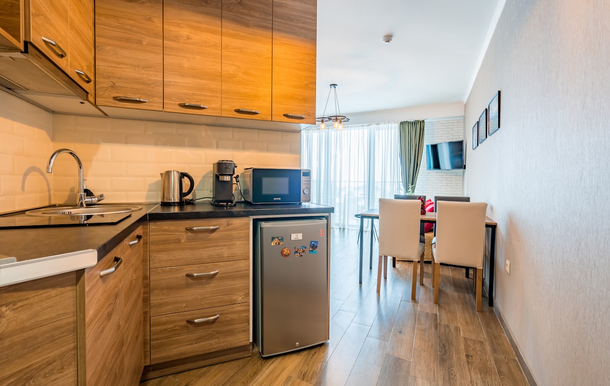 Fáilte chuig an stiúideo in Gudauri, an tSeoirsia, ag airde de 2200 méadar! Cruthaíonn athchóiriú úr le hadhmad agus cloch atmaisféar cluthar sléibhe. Soilsiú foirfe, áiteanna feidhmiúla - seomra suí, seomra leapa, cistin le fuinneoga lánléargais a thugann solas nádúrtha. Tá radhairc iontacha sléibhe ar fáil ar an taobh grianmhar. In aice leis an ardaitheoir sciála, siopaí agus bialanna - oiriúnach le haghaidh saoire sciála. Nascann an stiúideo seo stíl, compord agus feidhmiúlacht le haghaidh saoire dhodhearmadta.
