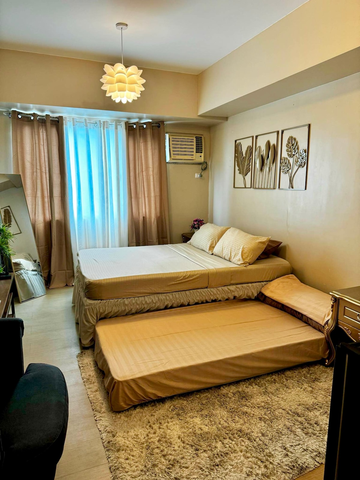 📢 LÉIGH SULA NDÉANFAIDH TÚ ÁIRITHINT, LE DO THOIL "Home Away from Home" – Aonad Stiúideo Tá 1 leaba lán/dhúbailte sa stiúideo cluthar seo🛏️, atá foirfe do bheirt, chomh maith le tocht urláir breise lán/dúbailte (thart ar 1 orlach ar tiús) ar féidir 🛋️ leo freastal go compordach ar 2 aoi eile. Ní chuirfear an tocht breise ar bun ach amháin má sháraíonn do chóisir 2 aoi. Is é do thearmann uirbeach foirfe é🏙️, i gceartlár Choimpléasc bríomhar Megaworld! 🌟