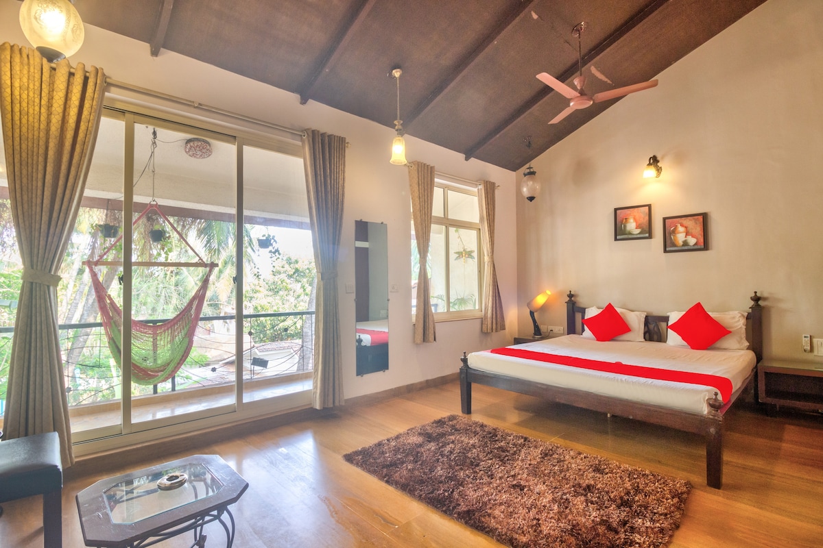 Is villa álainn 3BHK é BluJam Villa, Arpora, atá suite ar imeall locha i dTuaisceart Goa. Tá linn snámha phríobháideach gan imeall ann agus tá radhairc iontacha ar an loch (goirt i rith an tsamhraidh), ar an bhforaois agus ar luí gréine. 5 nóiméad go Baga, 10 go Anjuna & Calangute Intí galánta, cistin lánfheistithe, airí cónaitheach, cumhacht ghineadóra 24/7, spás páirceála dúbailte agus suaimhneas —agus é sin ar fad agus tú ag fanacht gar do na tránna, na caiféanna, an siamsaíocht oíche agus na nithe is díol spéise is fearr in Goa Foirfe do theaghlaigh agus do chairde - grúpaí de 5, 6, 7, 8 agus 9