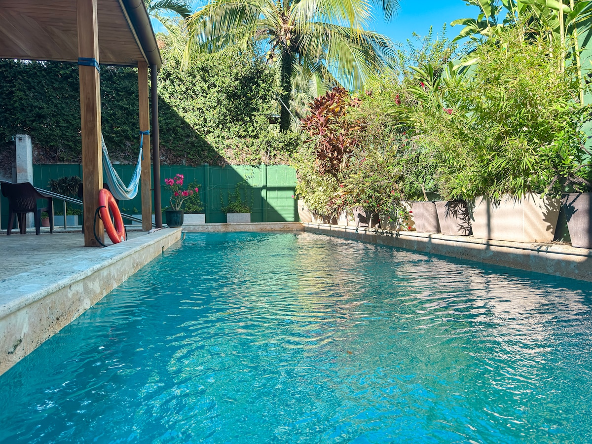Tá tolglann mór lasmuigh agus rochtain dhíreach ar linn snámha sáile le feiceáil sa tearmann príobháideach fairsing seo. Agus tú timpeallaithe ag glaise méith, beidh tú ar do shuaimhneas sa dufair - níl an trá ach 100 céim ó do dhoras! Téigh ag spaisteoireacht ar feadh an ghainimh agus sroich siopaí agus bialanna bríomhara Tamarindo faoi bhun 7 nóiméad. Is é an meascán foirfe é den tsíoraíocht thrópaiceach agus den áisiúlacht bhaile.