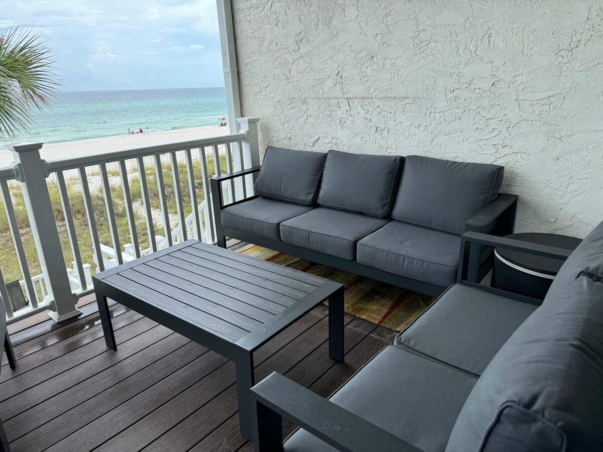 Tugaimid 'Beachside Joy' ar ár mbaile mór álainn teolaí 1BR -- is aonad tosaigh álainn é a shuíonn go díreach ar ghaineamh bán siúcra Panama City Beach! Nuair a fhanann tú anseo tá tú ar an trá -- ní gá ach siúl síos staighre na deice! Ní árasán nó óstán ardaithe é seo; níl aon ardaitheoirí ann le fanacht leo agus ní gá duit an trá a roinnt le míle cónaitheoir árasán eile. Tá sé iontach a bheith in ann siúl díreach amach an doras agus isteach ar an trá nó isteach san uisce!