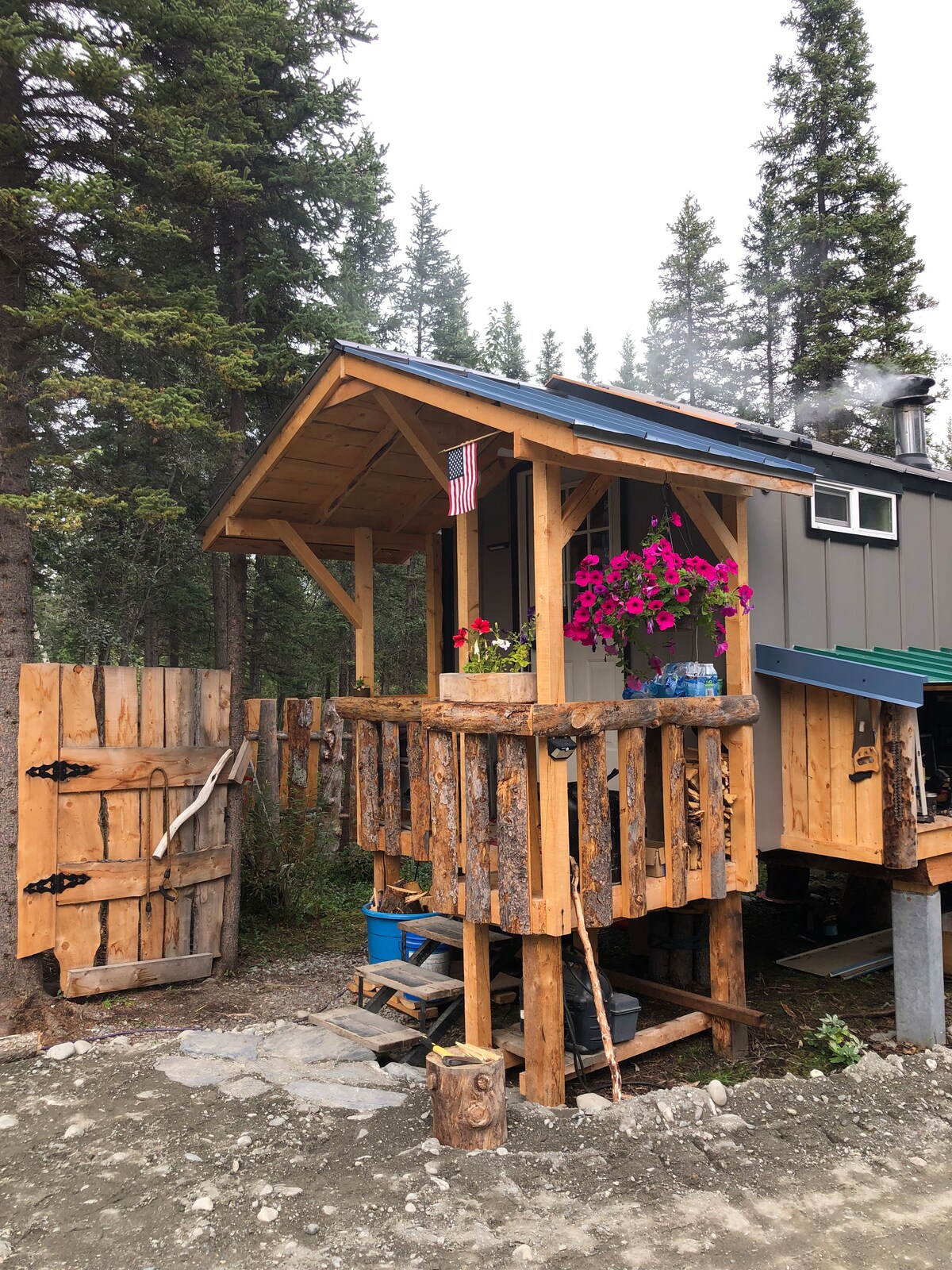 Cuireann ár gcábán logála uathúil seomraí codlata compordacha agus neart spás maireachtála ar fáil do ghrúpa de cheathrar. In aice leis an mbóthar, ach as radharc ina adhmad ciúin féin, tá sé suite go hidéalach freisin 2 nóiméad ar shiúl ó shiopa áise/stáisiún gáis/níochán. Is suíomh foirfe é seo do bhunáit bhaile roinnt laethanta chun iniúchadh a dhéanamh ar Abhantrach an Chopair, ar Pháirc Náisiúnta Wrangell St. Elias agus ar Valdez. Le cistin lánfheistithe, cúinne do pháistí agus léann maith, beidh tú ar do shuaimhneas.