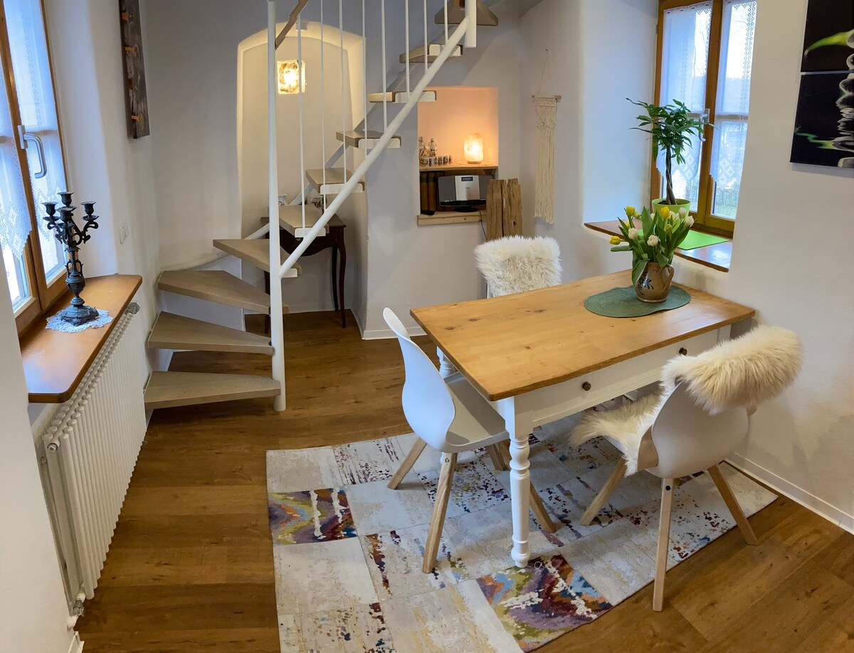 ÉALÚ IN ESCHENBACH Téigh siar agus lig do scíth sa teach ciúin, galánta agus geal seo. Buaileann an radharc le gairdín nádúrtha, do tholglann gairdín díreach ina lár. Aontaíonn stíl Boho agus comhghleacaíocht san árasán grámhar agus nua - chóirithe. Bricfeasta sa ghairdín nó gloine fíona sa ghrian tráthnóna ar an ardán, mar is mian leat. Cruthaíonn urláir adhmaid nádúrtha agus péint bhalla orgánach aeráid mhaith. Beidh tú ag mothú compordach.