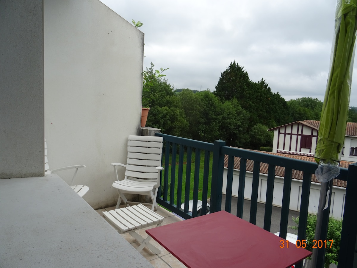 Árasán atá suite in Arcangues (5 nóiméad sa charr ó Biarritz), an 2ú hurlár agus an t - urlár deireanach, 30m2, ardán , páirceáil sa gharáiste , linn snámha , radhairc iontacha ar ghalf , ar shléibhte agus ar radharc ar an aigéan sa chúlra . Siopaí in aice láimhe os comhair an Chónaithe .