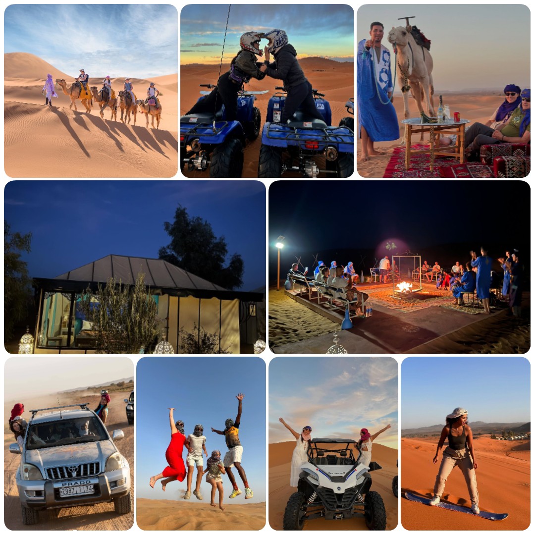 Cuireann Glamorous Camp fáilte romhat chuig fanacht nach ndéanfar dearmad air riamh i bhfásach Merzouga, áit a dtagann an t-álú agus áilleacht an dúlra le chéile. Ag tairiscint lochtaí príobháideacha, radhairc ar na sléibhte, agus áiseanna nua-aimseartha, tá bealach isteach príobháideach, seomra folctha en-suite ina bhfuil cithfholcadán siúil isteach, agus earraí níocháin saor in aisce i ngach puball fuaimdhíonach. Is féidir le haíonna taitneamh a bhaint as buifé bricfeasta saibhir nó béile sa seomra, scíth a ligean sa tolglann caife, nó dul ar eachtraí san fhásach amhail fánaíocht, sciáil agus siúl