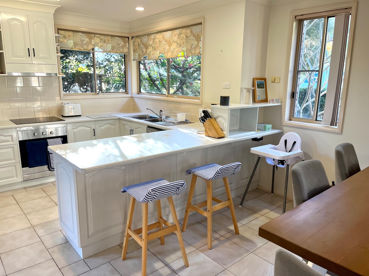 Tá ár dteach trá fairsing, le gairdín duilleach i cul - de - sac ciúin. Tá deiceanna grianmhara ann ar thrí thaobh, iontach le haghaidh maireachtála laistigh/lasmuigh. Tá sé díreach athchóirithe go hiomlán, le cistin den scoth, agus seomra folctha nua. Ligeann ár NBN (meánluas íoslódála 43 Mbps) duit oibriú ó chian. Sa tráthnóna, lig do scíth le Wi - Fi agus Netflix. Níl ach siúlóid 500m go dtí an trá surfála agus uisce fós Phort Stephens. Cúig nóiméad siúil chuig siopaí agus caiféanna Hawks Nest.