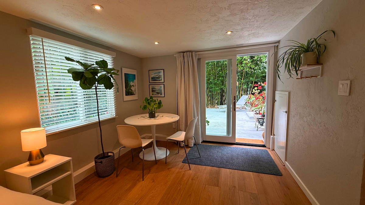Stiúideo príobháideach i dteach teaghlaigh ina bhfuil bealach isteach ar leith agus áit pháirceála thiomnaithe. Táimid lonnaithe i gcomharsanacht Redwood Heights in Oakland California le rochtain éasca ar shaorbhealaí, siopadóireacht, radharcanna agus bialanna. Is é seo an bonn baile foirfe do thaistealaithe náisiúnta agus idirnáisiúnta a thugann cuairt ar Cheantar na Bá. Tá cistinéad beag, seomra folctha, agus leaba chompordach de mhéid banríona sa stiúideo. Tá teilifíseán cothromscáileáin, Wi - Fi, agus paitió gairdín comhroinnte taobh amuigh den doras.