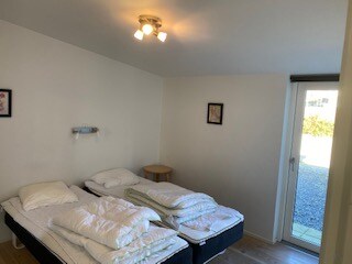 Newly built apartment, 50 m2. Includes 2 double rooms, small kitchen with fridge, coffee maker, mini oven, a single electric hob etc. Living room with sofa, dining area and bath/toilet. Private entrance, parking right by the door. Peacefully and idyllically located by Skamlingsbanken, 10 min. drive south of Kolding and E45. Lots of opportunities to enjoy nature in the area, large path system with beautiful views. Close to the child-friendly Binderup beach.