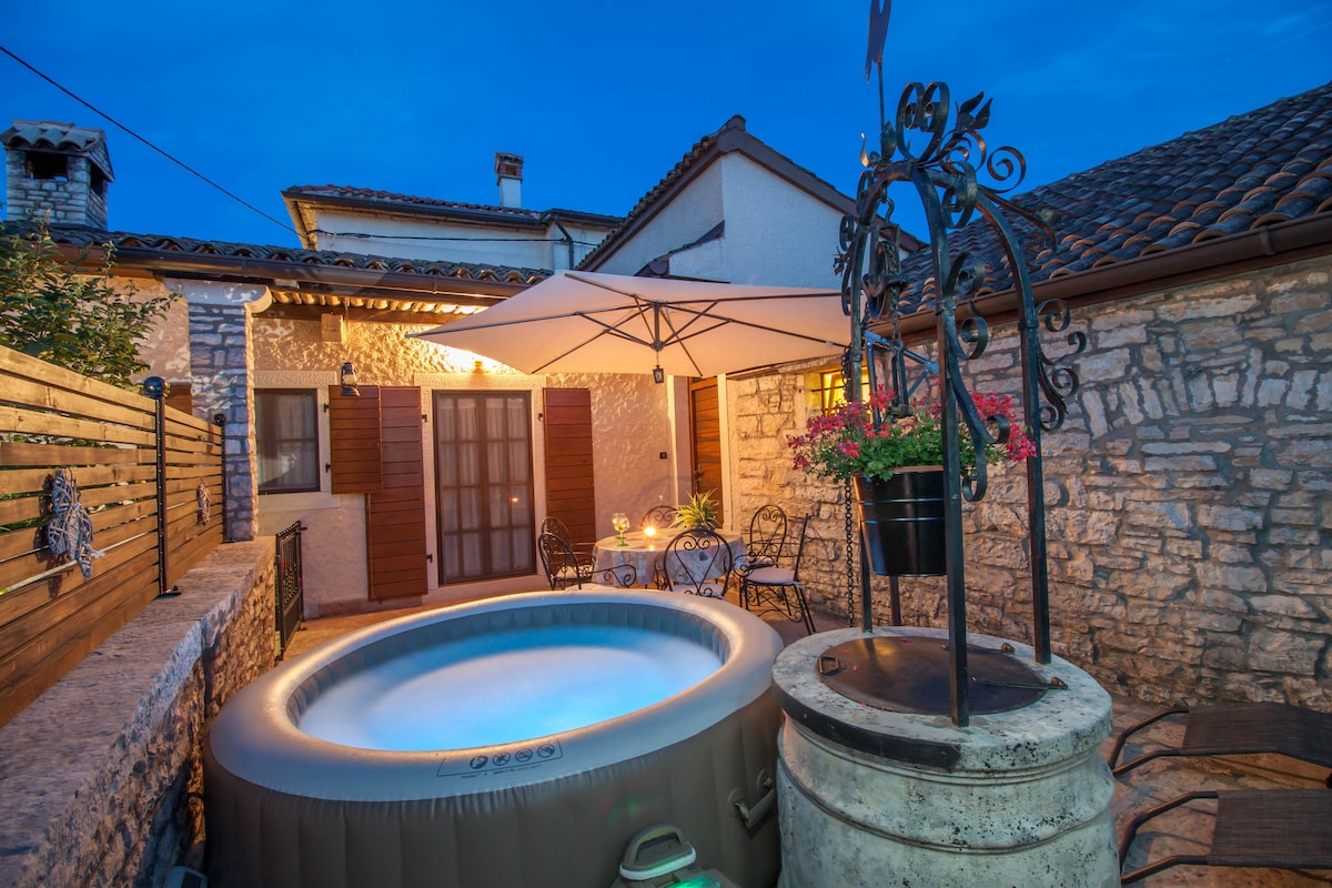 Teach barántúla stonebuilt Istrian suite i sráidbhaile beag in aice le cathair Pazin i Lár Istria. Tá an sráidbhaile suite deich nóiméad ón bpríomhbhealach go dtí an mórbhealach a nascann na cathracha móra go léir i Réigiún Istria. Timpeallaithe ag an dúlra slán le radharc draíochtúil ar Loch Butoniga, ceangailte le bealaí rothar, le tairiscint talmhaíochta de fhíor - tháirgí Istrian agus deis chun taithí a fháil agus oibriú i dtimpeallacht teaghlaigh tuaithe i dtalamh, beidh do laethanta saoire chomh foirfe le saoire shuaimhneach.