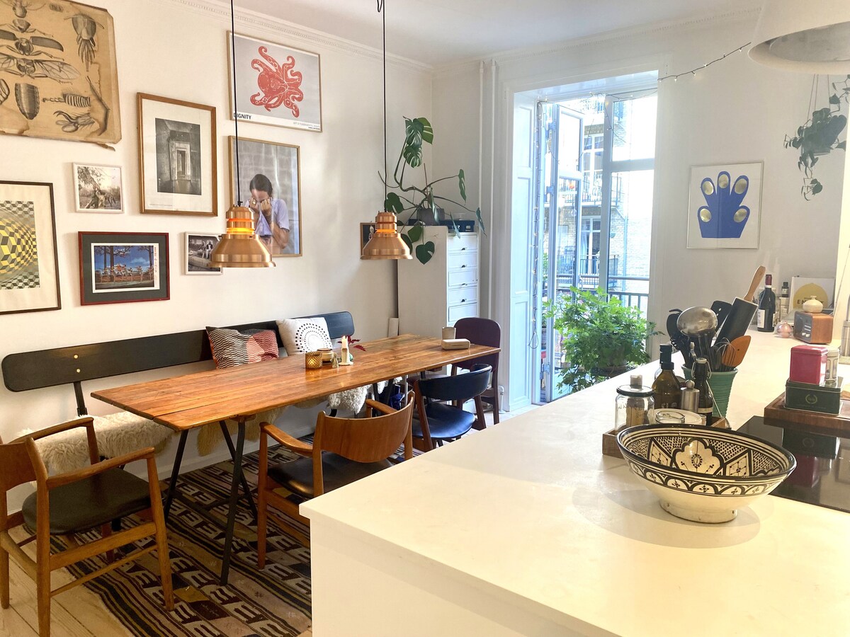 Árasán geal fairsing in Frederiksberg, 5–7 nóiméad ó mheitreo Aksel Møllers Have. Sroich lár Chóbanhávan laistigh de 10 nóiméad agus an t-aerfort laistigh de 45 nóiméad ar iompar poiblí. Foirfe do bheirt aíonna, le balcóin chluthar agus grian tráthnóna. Cistin lánfheistithe agus gar do chaféanna, do bhialanna agus do bheáir. Tabhair faoi deara: Is é seo mo theach príobháideach — agus is féidir libhse bheith ann le linn bhur bhfanachta ☀️