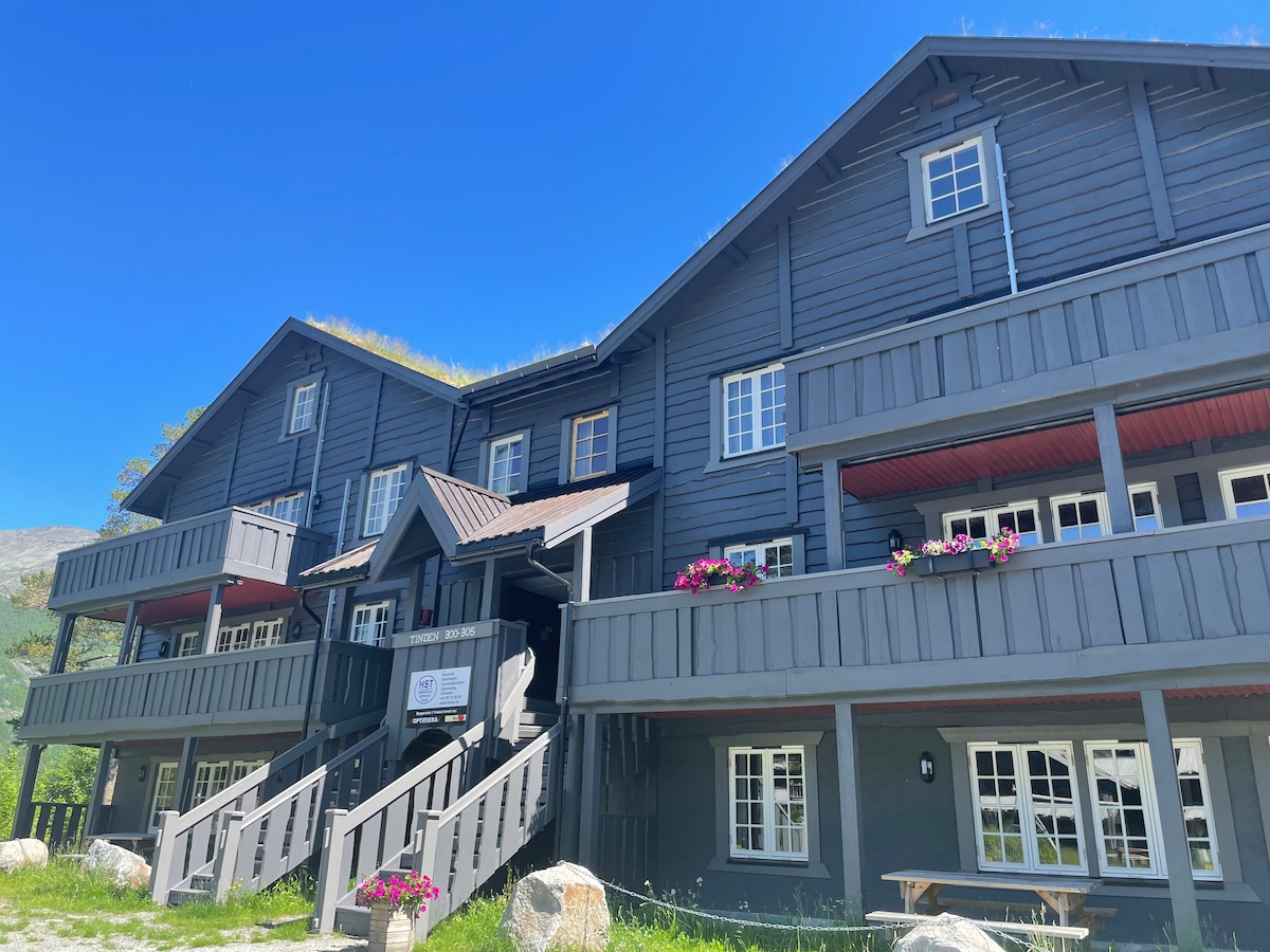 Tá Tinden suite go lárnach ag bun Hemsedal Skisenter. Achar gearr siúil go lár chathair Hemsedal, Fyri agus Stavkroa. Nollaig 2024 banda sciála nua agus cosán sciála ón gcarrchlós isteach san ionad sciála. 3 sheomra leapa le spás do 10 -11 duine. 2 sheomra folctha, 1 w/sabhna, cistin, seomra suí w/teallach, seomra stórála agus balcóin. Wi - Fi saor in aisce. Luchtaire feithiclí leictreacha inmhuirir, páirceáil saor in aisce. Nigh rothar lasmuigh. Samhradh: tá sé iontach do rothaithe, do theaghlaigh agus do ghrúpaí cairde. Geimhreadh: ní mholtar é do theaghlaigh ag an deireadh seachtaine, ag an mBliain Nua agus ag an gCáisc.