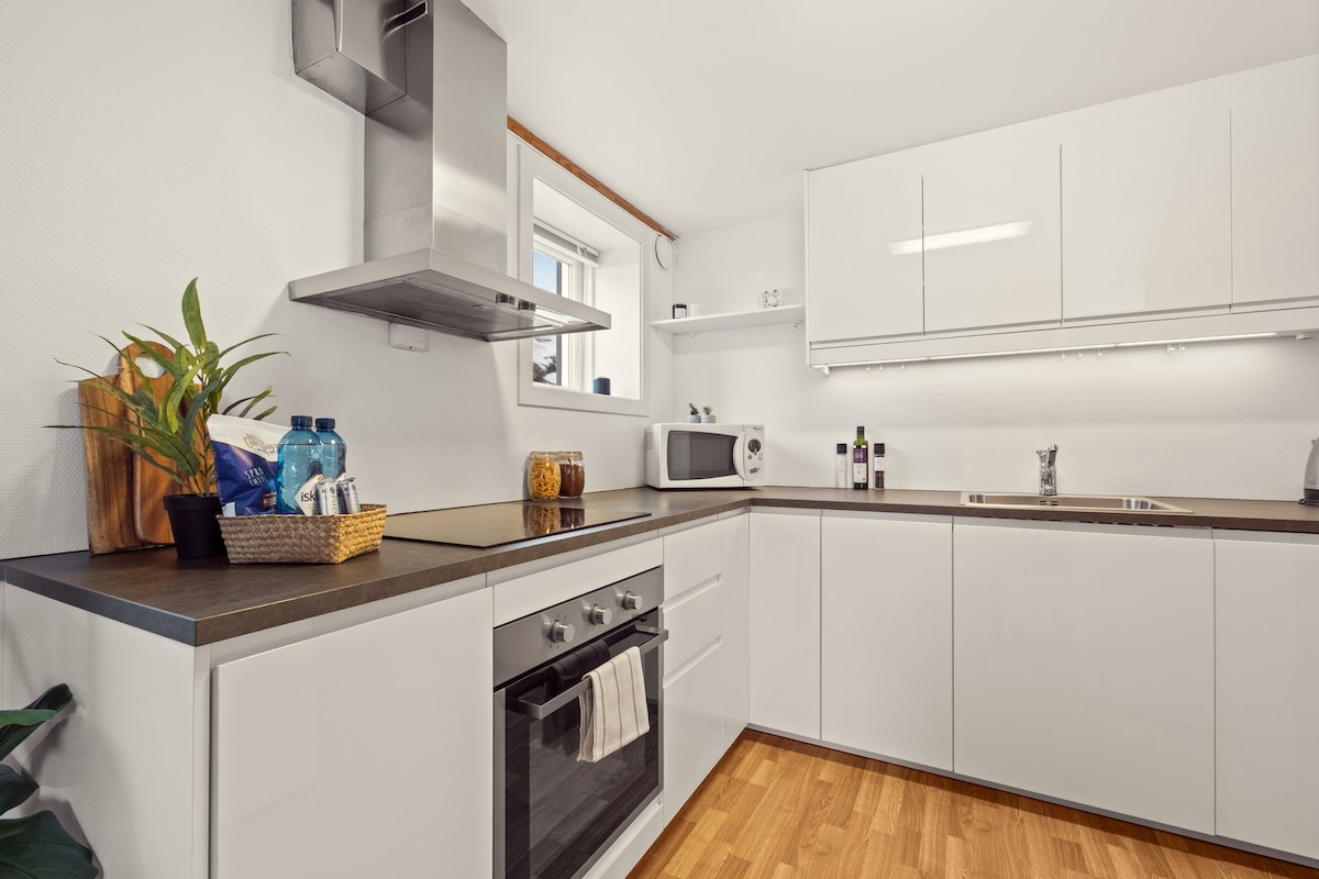 Cuir tús le do chéad eachtra eile inár n - árasán gleoite 3 sheomra dín i gcroílár na cathrach. Cuirfear fáilte romhat anseo le radhairc dhochreidte ar Kristiansund. Tá sé feistithe go hiomlán le bheith i do theach - ar shiúl - ón mbaile. Tá an chistin feistithe go hiomlán le fearais agus gach rud atá uait le haghaidh caife gach maidin! Bain sult as do bhéilí le chéile timpeall bhord an tseomra bia, nó lig do scíth sa spás compordach tá teilifíseán cothromscáileáin. Tá 1 charrchlós príobháideach saor in aisce suite taobh thiar den fhoirgneamh. Tá súil againn go bhfeicfidh muid go luath THÚ.