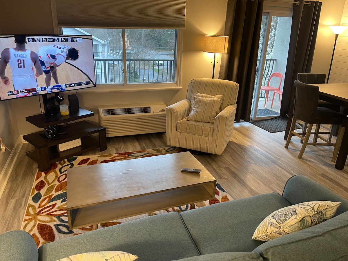 Buaileann stíl chósta an Iarthair leis an Atlantach san árasán athchóirithe seo (' 22, '23) ar an dara hurlár ar shráid chiúin, díreach leathbhloc ó shiopadóireacht, bia agus siamsaíocht oíche Rehoboth Avenue, agus díreach 4 bhloc ón trá. I measc na ngnéithe chompord nua - aimseartha tá aerchóiriú ciúin lárnach, teilifís sruthaithe 75" 4K, cistin lánfheistithe, agus clóiséid shaincheaptha. San áireamh tá 2 rothar cúrsóra, 1 áit pháirceála in áirithe ar an láthair, agus pas amháin le haghaidh páirceáil sráide neamh - mhéadraithe sa bhaile.