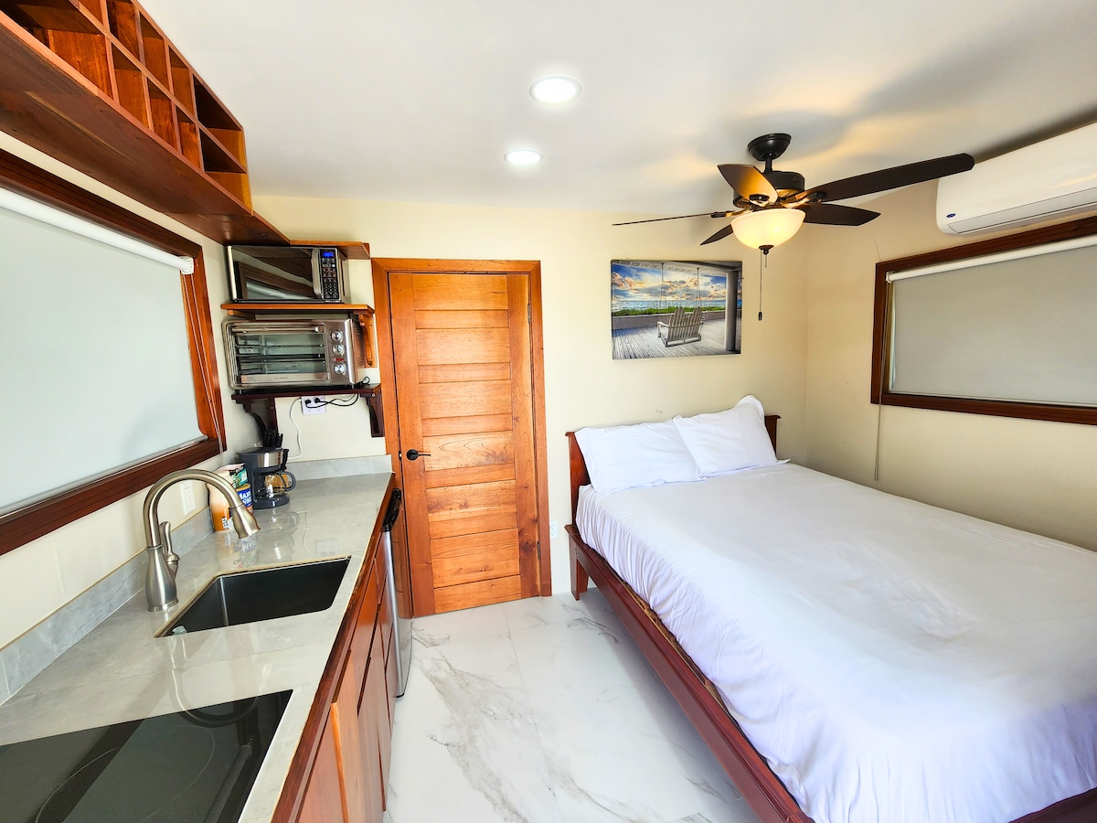 Weezie's Loft Studio is part of Weezie's Oceanfront Hotel and Garden cottages. There sleeping loft with a queen bed. There is a full kitchen, sitting area, full bath and private deck over looking the courtyard. Daily maid service, free kayak,canoe,and paddle board rentals. The lofts do not have an ocean view but are just 200 ft to the sea. Weezie's has an onsite open air restaurant serving Breakfast, Lunch and Dinner. Weezie's also offers snorkel and fishing tours.