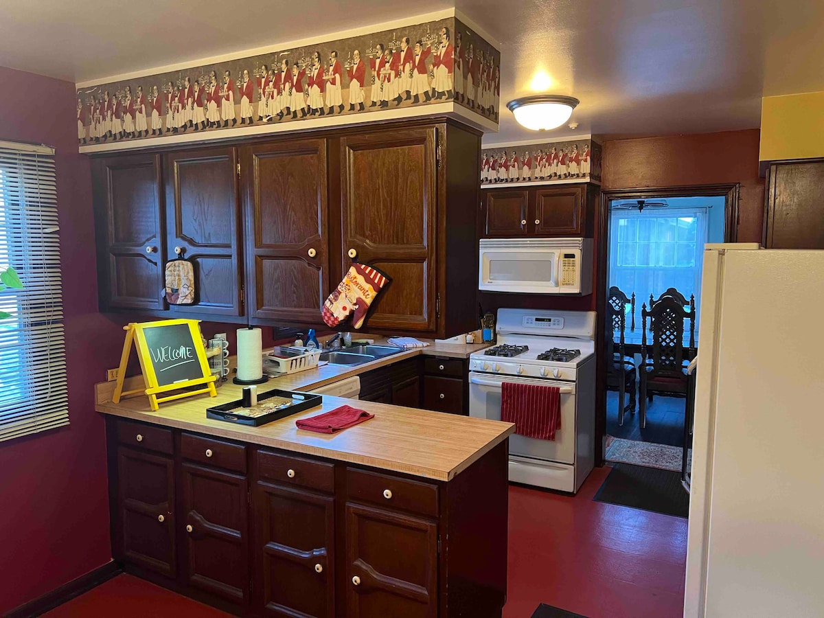Teach aíochta príobháideach nua - chóirithe. Leaba bhanríona seomra leapa amháin, folcadán w/cithfholcadán, cistin iomlán, lena n - áirítear micreathonnán agus cochaill déantóra caife Keurig san áireamh, teilifís seomra teaghlaigh, agus WI - FI. Is cuma má tá tú sa bhaile mór le haghaidh oibre, comórtais spóirt, teaghlaigh nó díreach saoire cuirimid gach compord ón mbaile ar fáil. Tocht Aeir ar fáil ar iarratas. Caith leat mar do theach féin, lean na rialacha tí go léir. Gan cóisir ná teacht le chéile. Is teach gan tobac é seo.