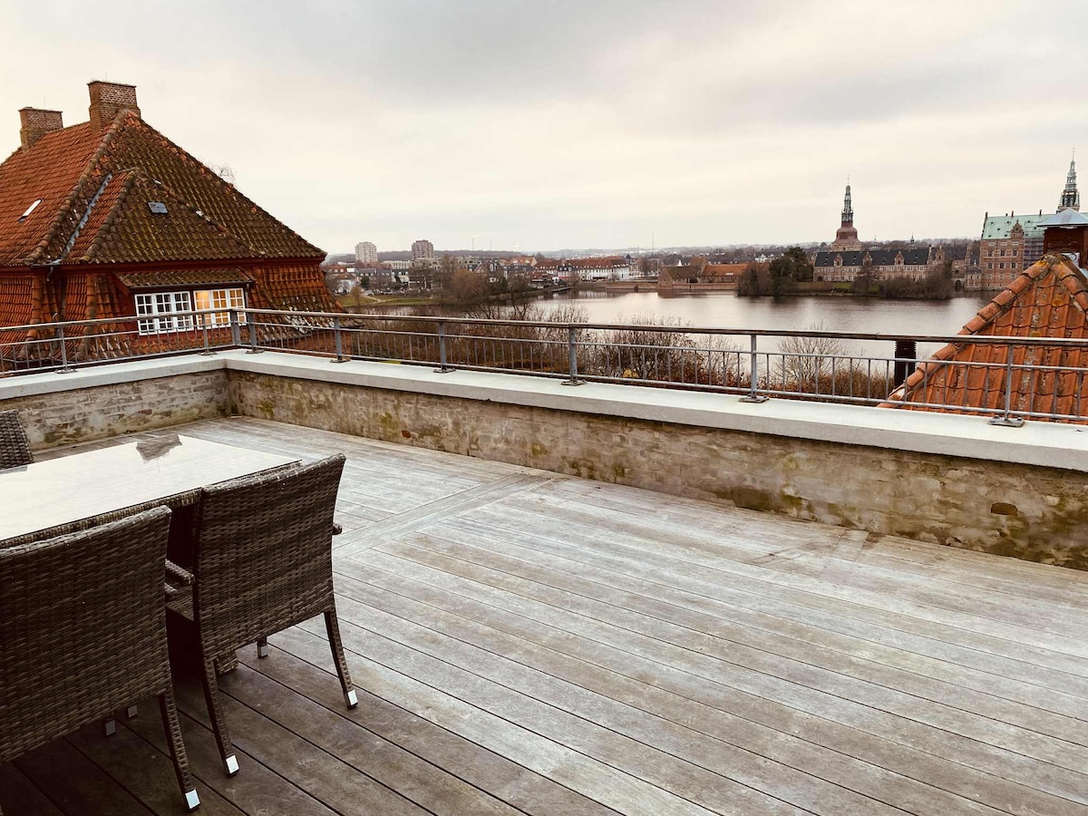 Experience luxury living in the heart of Hillerød! 2-level apartment on 2. floor offers 96m² of comfort and style, a huge 36m² terrace with breathtaking views of Frederiksborg Castle, the lake Slotssøen, and baroque gardens. The apartment has fast WiFi, dishwasher, & private parking. Walk to the castle, lake, shops, and the train station.