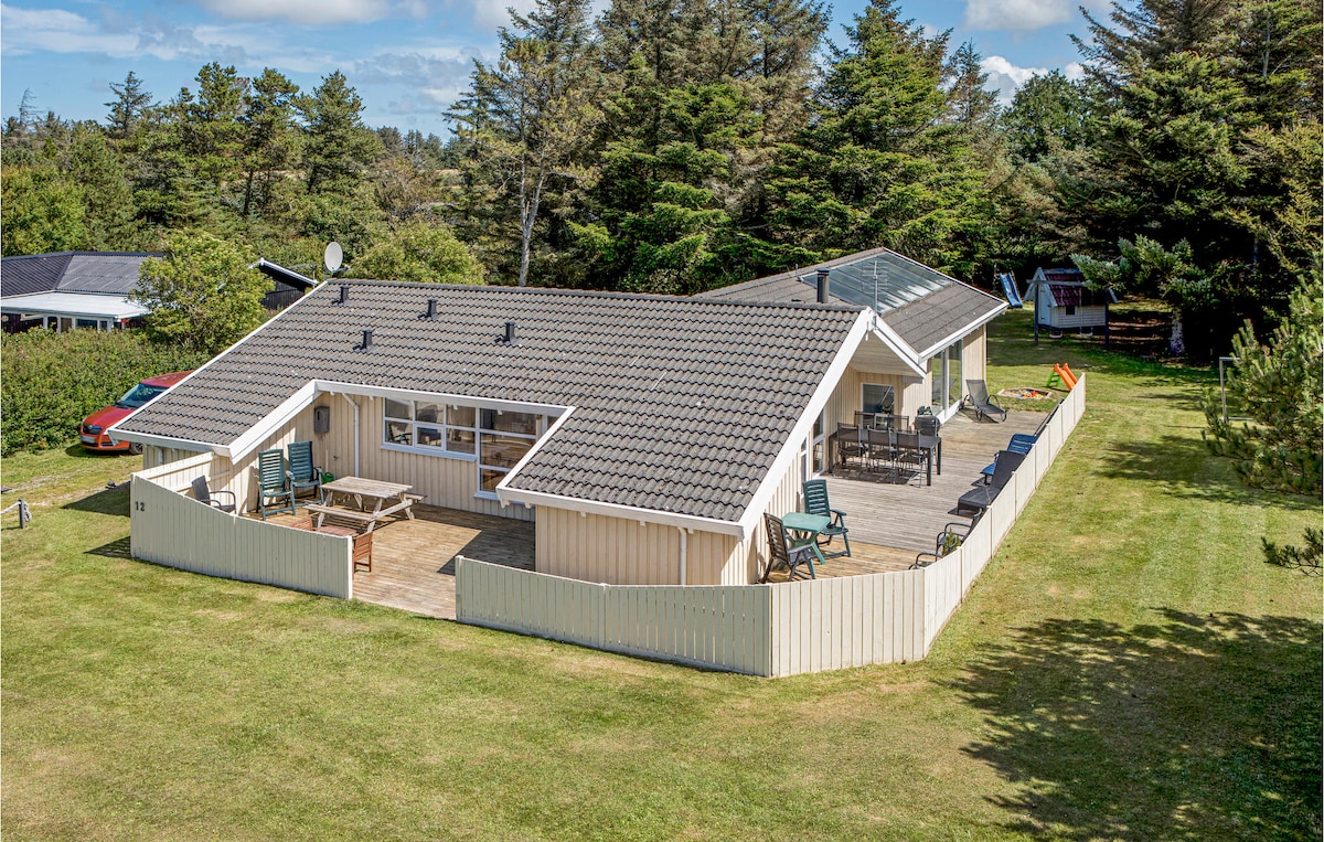 Lig do scíth le do theaghlach agus le do chairde, gan ach 300 méadar ón Muir Thuaidh agus tiomáint/siúlóid ghearr go lár cathrach atmaisféarach Løkken (thart ar 1.2 km) Tá cúig sheomra mhaithe agus dhá sheomra folctha sa teach, 151 m². Dhá lochta mhóra mar spás codlata breise nó le haghaidh comhghleacaíochta. Do fholláine féin 46 m² le linn snámha le traenálaí snámha, spá agus sabhna ionsuite. Ardán mór atá os comhair an iardheiscirt le haghaidh scíthe, áit ar féidir leat suí agus éisteacht le tonnta tuairteacha na Mara Thuaidh. Grianán mór le téitheoir paitió chun taitneamh a bhaint as tráthnónta fada.