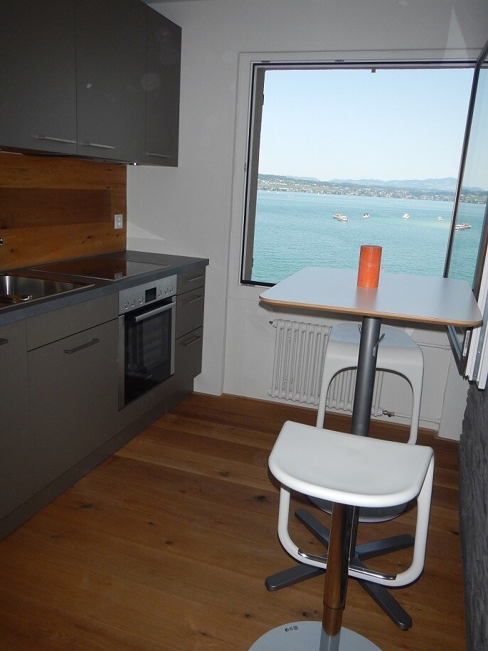 Tá bealach isteach príobháideach, seomra folctha agus cistinéad inár stiúideo a ndearnadh athchóiriú air le déanaí ar a bhfuil radharc ar an loch. Tá an stiúideo iontach do thaistealaithe aonair, do lánúineacha agus do theaghlaigh bheaga (tá áit chodlata ann do suas le 3 dhuine). Tá páirceáil saor in aisce ar fáil in aice leis an stiúideo. Siúlóid 5 nóiméad atá ann chuig siopaí agus bialanna, siúl 2 nóiméad chuig an mbus, siúl 10 nóim chuig stáisiún traenach Richterswil. Tá Richterswil 27 nóim le traein/ 25km ó phríomhstáisiún Zürich.