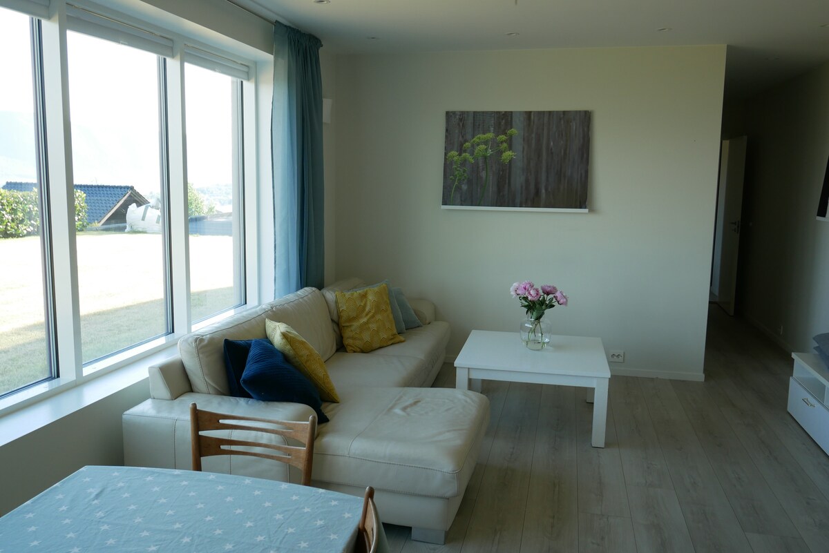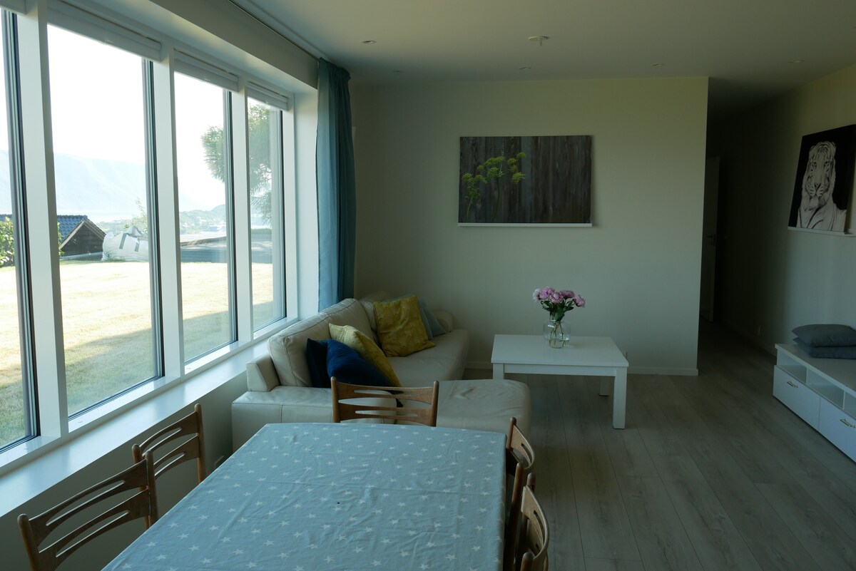 Díreach méadar ó lár an bhaile, ach an - chiúin ag deireadh bóthair chúng, le fjord iontach agus radhairc sléibhe! Tá do spás páirceála os comhair ár dtí, agus téann tú síos staighre ar an taobh amuigh chuig do bhealach isteach. Tá vardrús mór ag an iontráil. Ansin tá an chistin nua - aimseartha agus lánfheistithe. Tá teaglama triomadóra cithfholcadáin agus meaisín níocháin sa seomra folctha. Síos an halla tá seomra leapa ina bhfuil leaba 150x200cm agus vardrús mór, agus seomra suí ina bhfuil leaba thoilg a tharraingíonn amach go 140x200cm agus cliabhán. Fáilte!