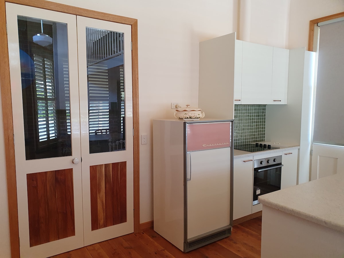 Private access & your own secure yard! King bed & smart TV; NETFLIX and Paramount included. Coffee & toast supplies included also! Pet friendly with doggy door. Washing machine & dryer. Kitchen facilities; portable electric cooktop, air fryer & electric frying pan. In a new estate, short drive to town and walking distance to river and coffee pod at end of our street. Check in ANYTIME AFTER 2pm key lock box at door (arrive as late as you like). Message us- questions and enquires welcome😊