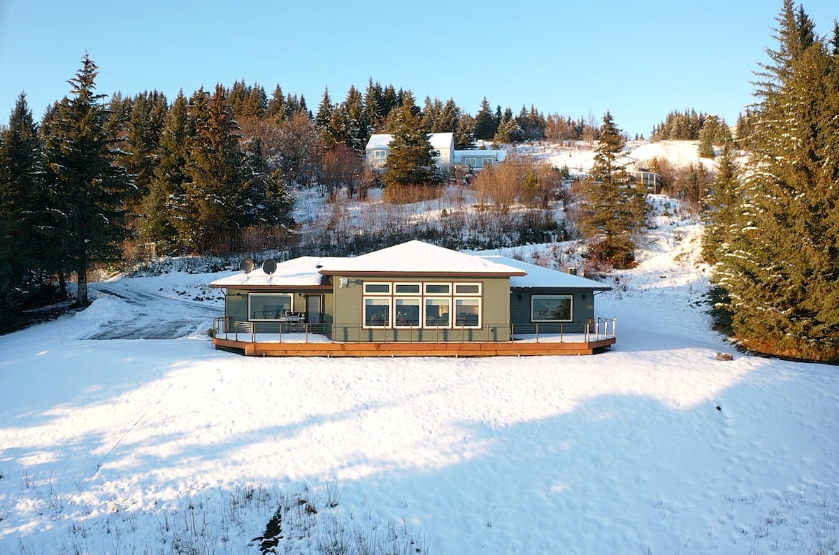 Tar agus bain sult as ár saoire saoire nua - aimseartha agus uathúil! 3 nóiméad ó lár Homer agus 10 nóiméad ón Homer Spit. In aice leis an mbaile i gcomharsanacht chiúin ina bhfuil radhairc de Chuan Kachemak. 1 Leaba mhéid an rí -1 seomra folctha le ceann cithfholcadáin báistí - Limistéar maireachtála coincheapa oscailte Teallach gáis nádúrtha nua - aimseartha - Smart TV - Cistin iomlán Wi - Fi ardluais (50mbps) - Páirceáil saor in aisce - Rochtain ar an gcód eochrach - Spá Nordach le tobán te, sabhna, agus plunge fuar