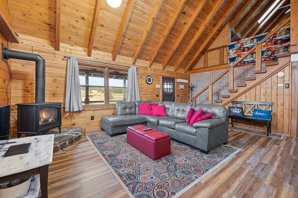 Bain sult as cónaí sa tír gar don bhaile mór! Ligeann dhá sheomra leapa le leapacha ar mhéid na banríona agus an lochta le tolg ar mhéid na banríona duit codladh go compordach 6! Níl sé ach 4 mhíle ó Downtown Hill City. Suíonn sé ar 20 acra álainn timpeallaithe ar 3 thaobh ag Seirbhís Foraoise! Bain sult as timpeallacht álainn - lochán séasúrach lasmuigh de do chábán (athraíonn leibhéal an uisce), capaill, mion - asal, mionghabhair agus sicíní. Bain sult as suíomh príobháideach le háisiúlacht na n - úinéirí díreach 1/4 mhíle suas an cabhsa chun aire a thabhairt do do riachtanais!