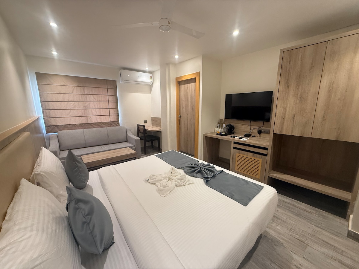 Tá leagan amach níos mó, dea-phleanáilte inár Seomra Galánta Préimhe Spásach atá deartha chun compord agus scíth níos fearr a thabhairt. Tá go leor spáis sa seomra chun bogadh thart go héasca, scíth a ligean, agus taitneamh a bhaint as fanacht suaimhneach i dtimpeallacht ghlan chompordach. Tá taobh istigh nua-aimseartha, aerchóiriú, Wi-Fi saor in aisce, teilifís scáileán comhréidh, línéadach tí úr agus seomra folctha príobháideach sa seomra. Foirfe do thaistealaithe aonair, do lánúineacha agus d'aíonna gnó atá ag lorg seomra óstáin fairsing den scoth in aice le haerfort Kolkata.