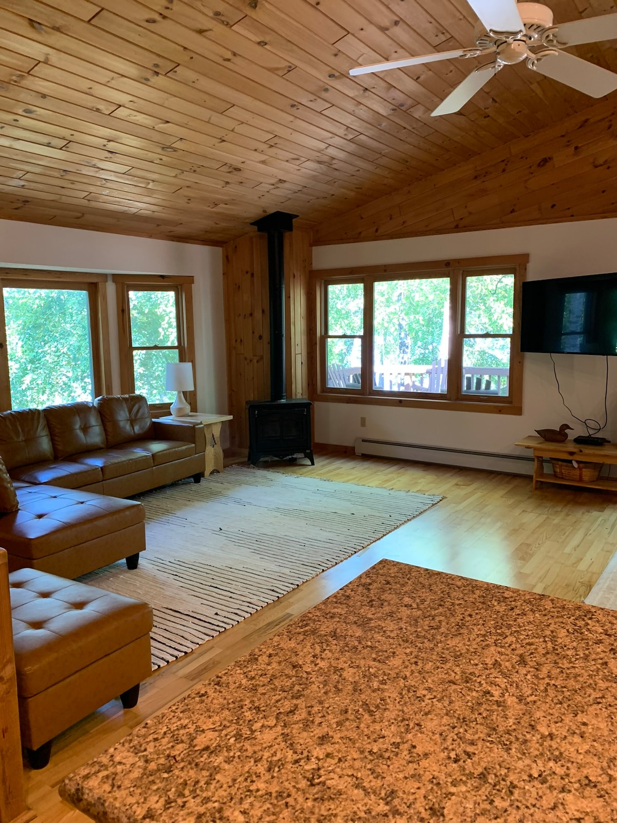 Scaoil ag an gcábán álainn nua - aimseartha seo i stíl tí feirme ar Big Stony Lake! Tá plean urláir oscailte agus maireachtáil fhairsing sa chábán úrnua 1888 troigh chearnach seo atá feistithe go hiomlán. Tá 3 sheomra leapa, oifig/codladh breise, 2 1/2 sheomra folctha, agus cistin lánfheistithe ann. Téigh ar maos sna radhairc áille ar an loch ón bpaitió mór lasmuigh nó ón tsíleáil go dtí fuinneoga urláir. Is é an cábán seo an áit fhoirfe le haghaidh fíor - shaoire ghearr ó thuaidh inar féidir leat taitneamh a bhaint as saol an locha agus as an timpeallacht shuaimhneach choillteach ó cheann ceann na bliana!