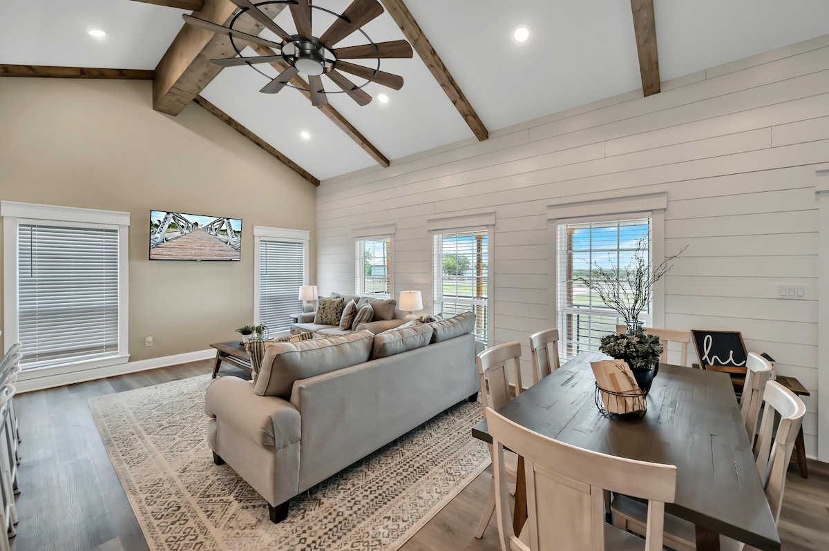 Éalaigh go dtí ár Paradise secluded! Is seoid i bhfolach é an teach 5 acra, 2400+ troigh cearnach seo i bhfolach díreach 2 nóiméad ó I -35. Tógtha in 2017, cuireann sé tearmann sómasach ar fáil ar bhóthar tuaithe suaimhneach. Déan iniúchadh ar áilleacht bíomaí sciobóil athghinte, máistirsheomra ina bhfuil seomra folctha fíorálainn, agus dhá sheomra leapa breise. Bain sult as cuideachta llamas agus spraoi lasmuigh lenár gclaiseanna niteora agus crú capaill. Níl ach 10 -12 nóiméad ó Magnolia Silos agus Baylor, agus 5 nóiméad ó Homestead Heritage Craft Village. An tsaoire fhoirfe