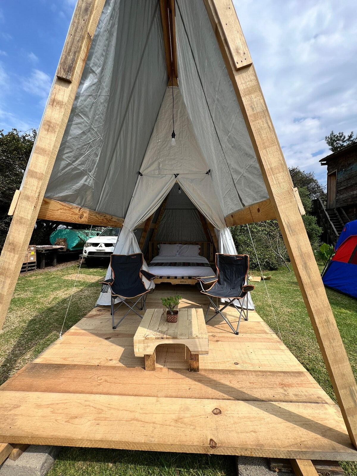 Enjoy an authentic glamping experience in Pátzcuaro, surrounded by nature, tradition, and tranquility. Rest in a spacious bell tent decorated with Day of the Dead–inspired details, featuring two double beds on an elevated platform. Shared outdoor areas include a central fire pit, open-air cinema, photo spots, and green spaces, along with clean and functional communal bathrooms. A cultural retreat designed to disconnect and experience Michoacán from a different perspective.