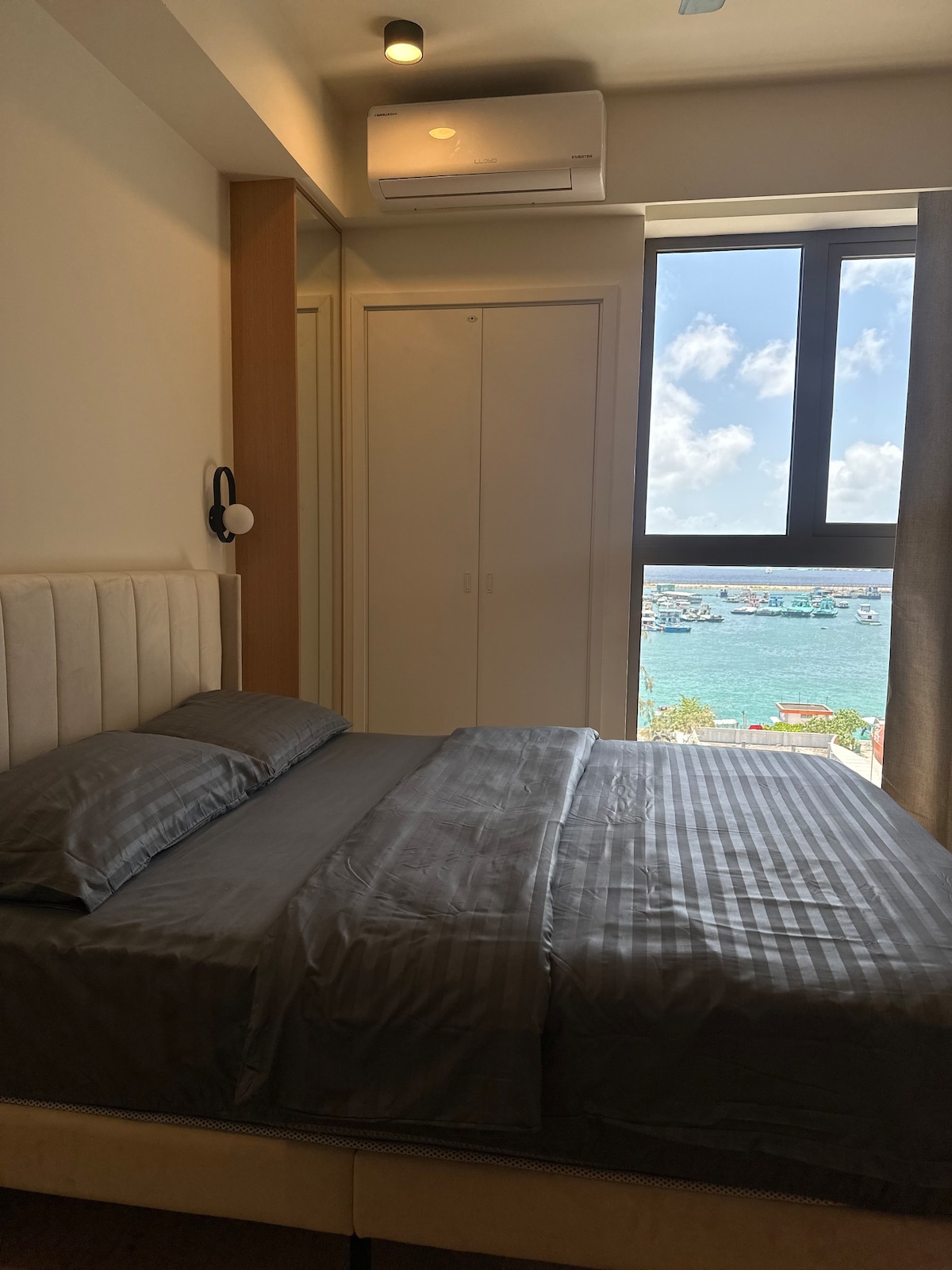 Lig do scíth in árasán fairsing 3BR ina bhfuil folcadáin ensuite, balcóin phríobháideach agus radhairc iontacha ar an bhfarraige. Bain sult as rochtain ar linn snámha ar dhíon éigríche, ar ionad aclaíochta agus ar tholglann billéardaí. Níl sé ach 10 nóiméad ón aerfort. Cistin lánfheistithe, Wi - Fi, Netflix & meaisín níocháin san áireamh. Foirfe do theaghlaigh, do ghrúpaí nó do stadanna gearra. Siúl go críochfort farantóireachta, féach ar luí gréine ar an díon agus tosaigh do lá le caife ar an mbalcóin .”