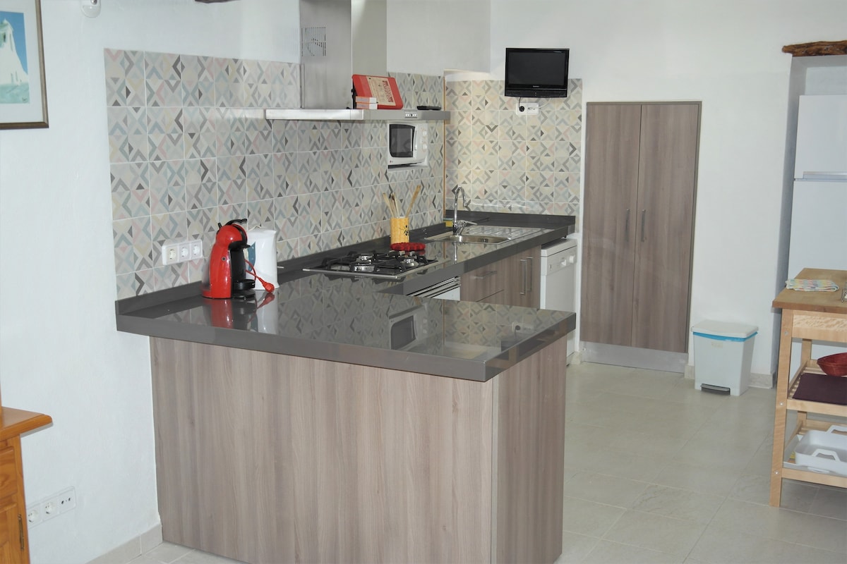 Teach deas 80m2 i stíl Ibizan. Tá 2 sheomra leapa dúbailte ann, seomra folctha amháin, seomra suí, cistin lánfheistithe le hob, micreathonnán, páirceáil, garáiste, bbq, meaisín níocháin, línéadach tí, tuáillí, tuáillí trá, teilifís Chliste, ceol Cd, Wi - Fi snáthoptaice, srl. 10000m2 de thalamh flannbhuí, agus torthaí agus glasraí orgánacha séasúracha. Aird dhíreach leis na húinéirí, fáilte chroíúil, agus leideanna iontacha. Eispéireas uathúil in Ibiza. Ceadúnas Turasóireachta ETV -1080 - E