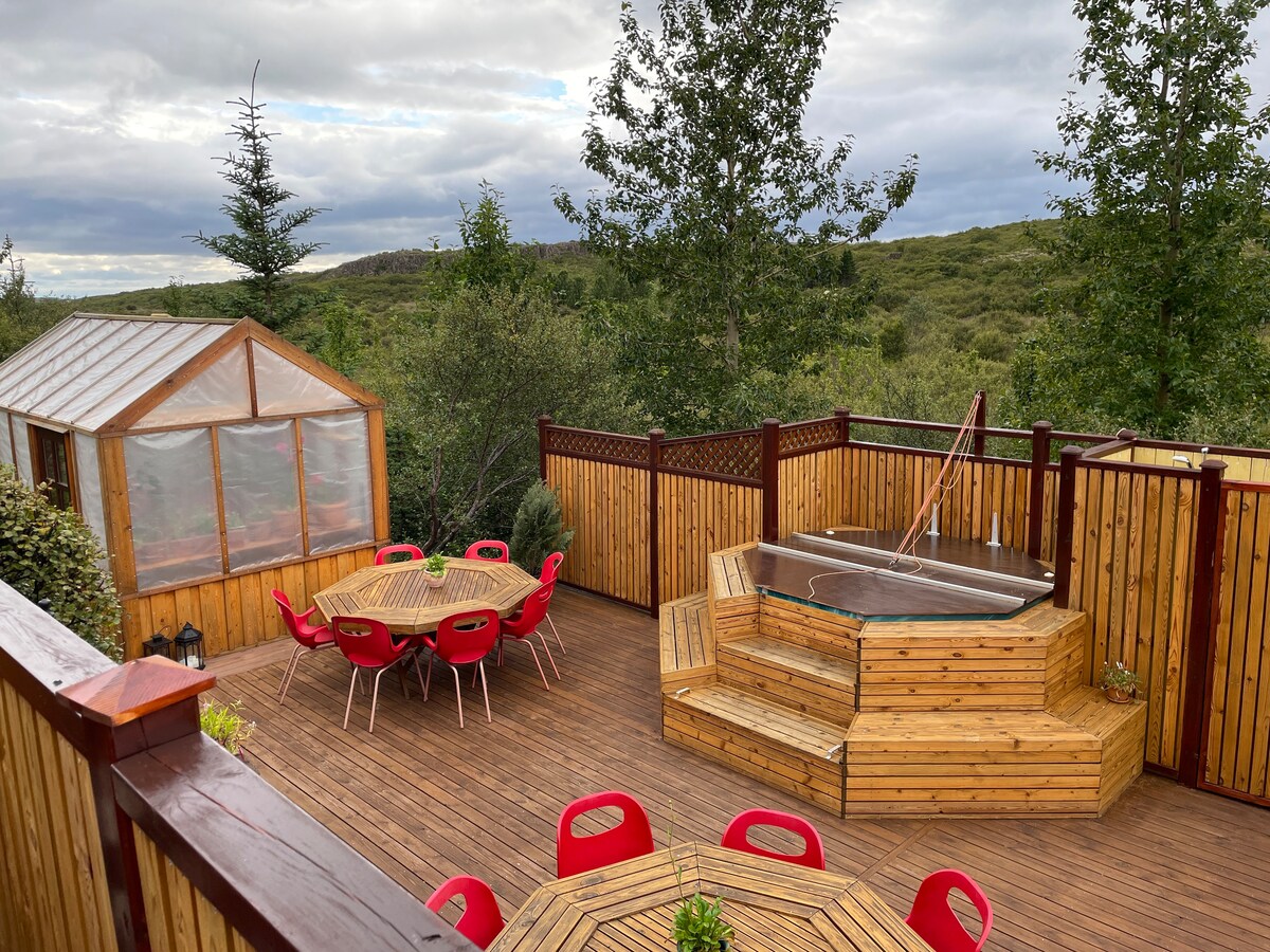 Éalaigh chuig cábán logála rómánsúil de chuid na hÍoslainne a mheascann só nua - aimseartha le háilleacht nádúrtha. Bain sult as teallach teolaí, cistin atá feistithe go hiomlán, agus radhairc iontacha ón ardán. Ligigí bhur scíth le chéile i dtimpeallacht shuaimhneach, le sauna agus jacuzzi. Linn snámha 10 nóiméad ar shiúl ag Borgir Grímsnes. Tearmann na lánúine foirfe — príobháideach, galánta, agus gar do Gullfoss, Geysir, agus Thingvellir.