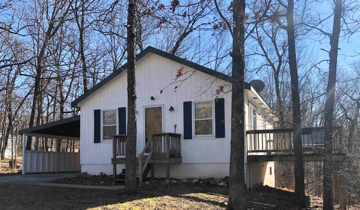 Tá an teachín cluthar seo sa choill (a críochnaíodh i mí an Mheithimh 2017) foirfe do lánúin atá ag lorg saoire ghearr rómánsúil, ag baint sult as mí na meala, nó ag ceiliúradh comóradh. (Is leaba iomlán in - chomhshóite é an tolg, má tá sé beartaithe ag daoine eile an spás 400+ troigh chearnach a roinnt.) Lonnaithe i gcomharsanacht Ghalfchúrsa Lake Hill (Shadow Lake roimhe seo) (tá an cúrsa dúnta faoi láthair) thart ar mhíle ó bhruacha NW de Pomme de Terre Lake álainn, agus thart ar 6 mhíle ó dheas ó Lucas Oil Speedway.