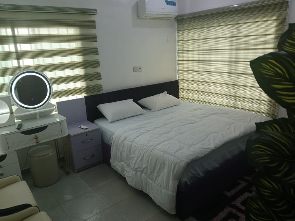 Priced for long stay, fibre internet Wifi, three (3) Air conditioners, hot water, Solar Inverter system, secured, large beds, private backyard, private car park, spacious kitchen, children playground, smart TV, neaby trees/wood to collect fresh air and more. Relax with the whole family at this peaceful place. Suitable work space/desk in place. NGN 10,000 worth of electricity units provided on check in, after which guest will be responsible for electricity cost.