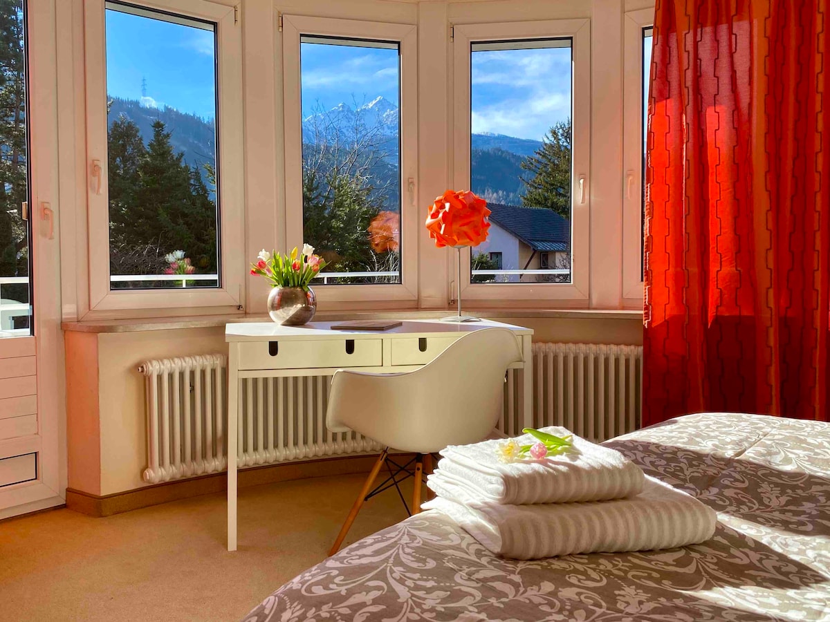 Árasán a bhfuil cuma éadrom air (thart ar 48m2) le balcóin agus radhairc ar fud Innsbruck. 1 seomra leapa, seomra ina bhfuil cistin, seomra folctha ina bhfuil leithreas agus tobán folctha mar chithfholcadán. Tá dallóg ar an taobh amuigh sa seomra leapa le haghaidh dorchaithe. Sa seomra ina gcónaíonn an chistin, áit a bhfuil an tolg tarraingthe amach don 3ú duine, tá cuirtíní ann mar rogha lándorchaithe.