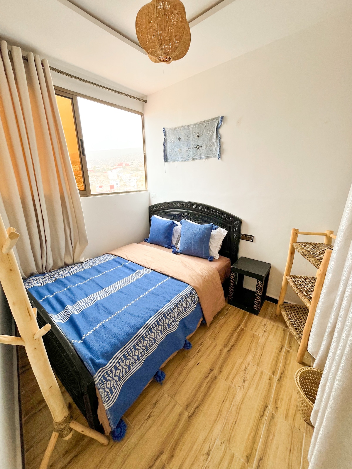 This unique place is located in a quite and calm part of Tamraght with a pretty view to Banana Beach and everything you need close by. The newly built house is designed with lots of love and an eye for detail. Take your rest in your two-bedrooms apartment with a beautiful miniriad or enjoy the sunset on a shared rooftop where you can also prepare your dinner in a fully equipped outdoor kitchen, relax in a lounge area or get your work done with good Wi-Fi.