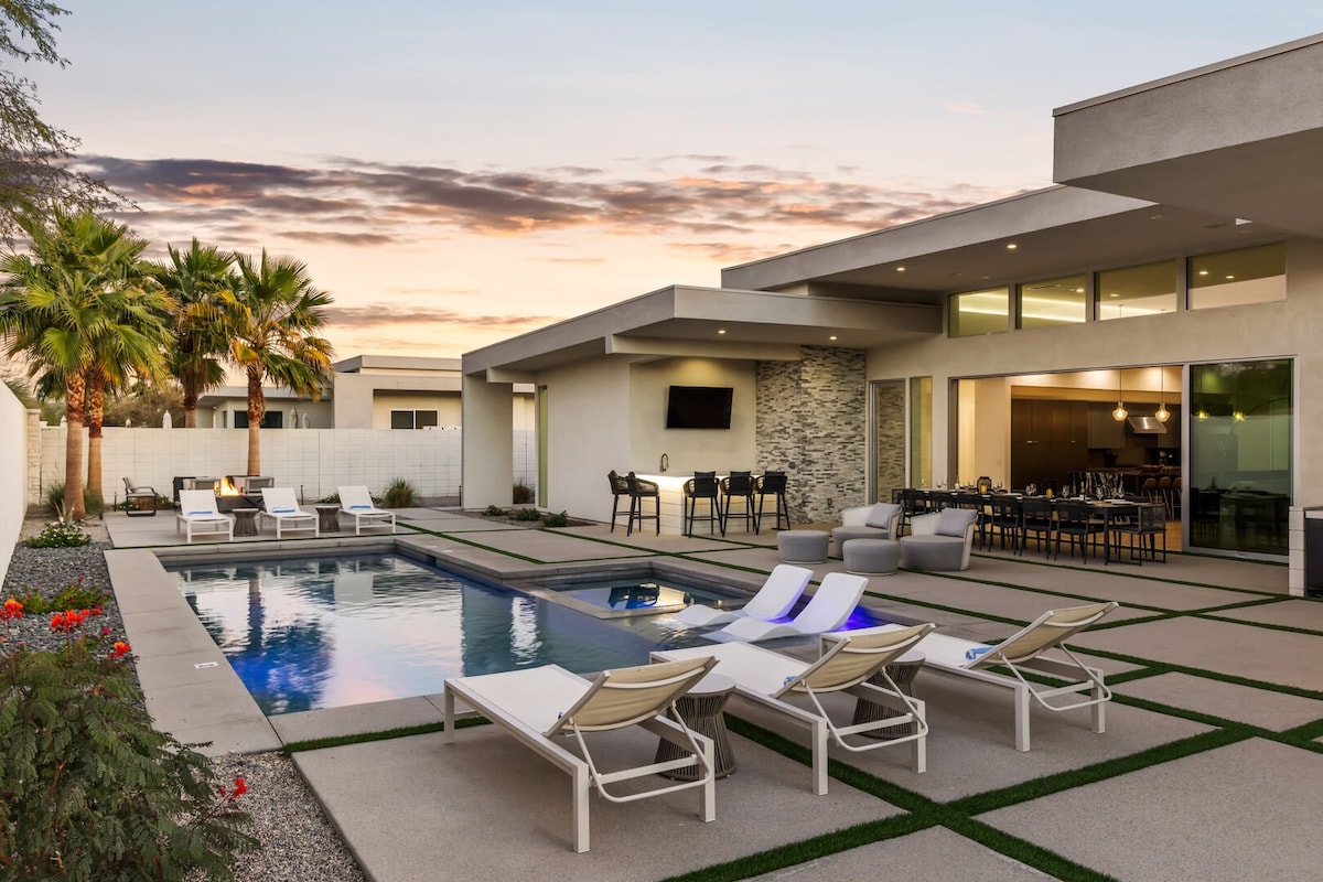 Elemento Platinum is a luxury desert estate part of the Elemento 49 community; Featuring 9 custom built modern homes by award winning architect Charles Austin all designed with sophistication and functionality to be the ideal luxury vacation experience. The perfect spot for large groups, can comfortably sleep up to 18 guests, and can be combined with the Gold property next door to sleep up to 36 guests! With a pickleball court, luxury pool/spa, and fire pit you'll never be saying "I'm Bored!"