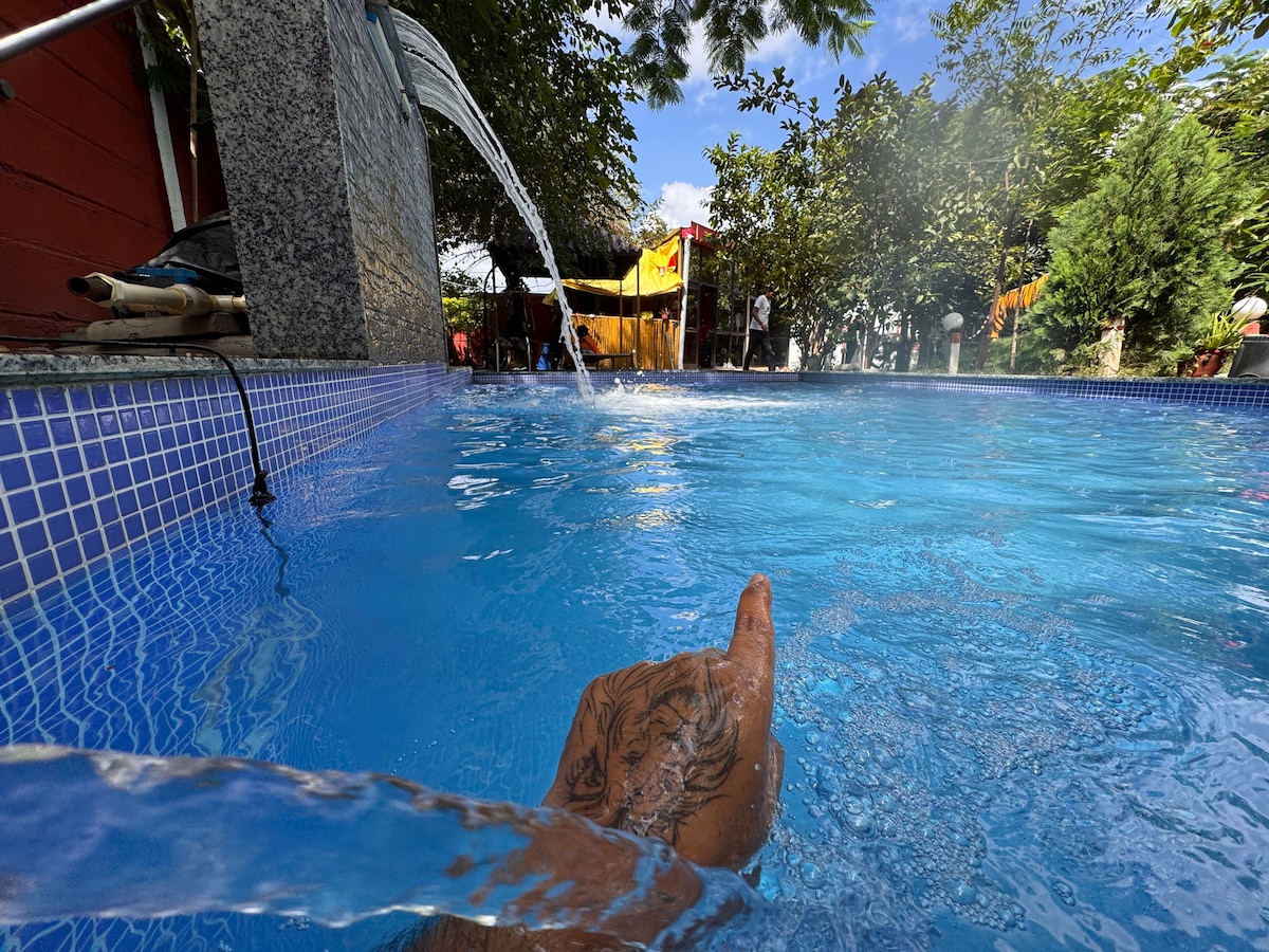 Éalaigh go dtí The 2 Pines – ósais uirbeach shuaimhneach 2 acra in Indore. Tá dhá sheomra leapa neamhspleácha sa bhfanacht príobháideach seo ar fheirm, suite i measc crainn pailme agus gairdíní méith, rud a thugann spás duit le haghaidh ceangail agus suaimhnis. Tosaigh do mhaidineacha le ceol na n-éan, caith tráthnóna ag an linn snámha nó ag bia a ithe amuigh faoin aer, agus lig do na hoícheanta titim amach faoi spéir lán de réaltaí — foirfe do shaoirí gearra shuaimhneacha nó do cheiliúradh príobháideach. Tabhair faoi deara: Ní bheidh an áit áineasa (suíocháin laistigh le snúcair) ar fáil ar an 31 Nollaig.