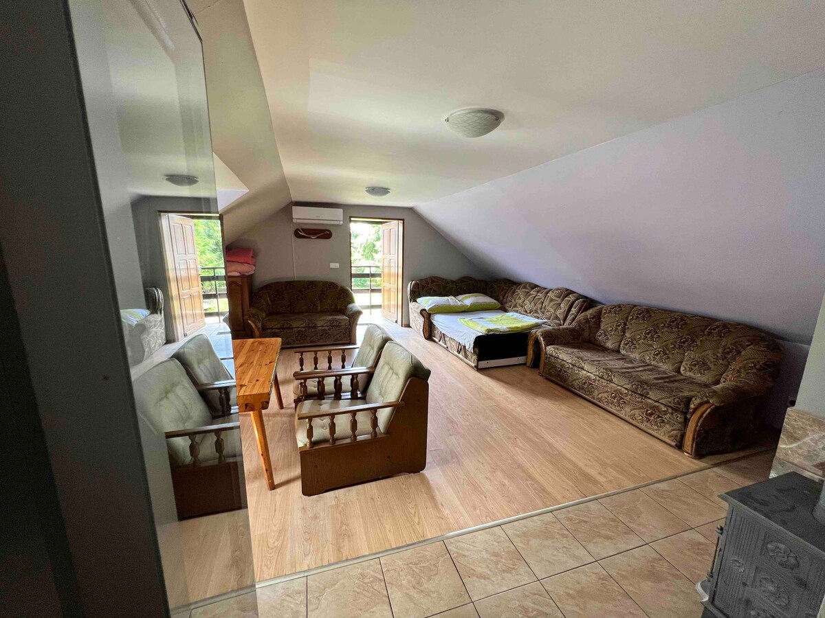 Tugaimid cuireadh duit chuig áit uathúil a mhúsclaíonn na céadfaí, a athbhunaíonn an comhchuibheas inmheánach agus a ligeann duit fíor - scíth a ligean. Ní hamháin gur teach é - is fíor – thearmann foraoise é atá i bhfolach i measc na gcrann. Foirfe nuair is mian leat ciúnas, scíth dhomhain agus teagmháil a dhéanamh leis an dúlra. Anseo is féidir leat anáil a tharraingt go domhain, moilliú agus athluchtú le fuinneamh maith. Tusa amháin, meirg na gcrann agus canadh na n - éan. Tabhair cuairt orainn agus athaimsigh fuaim an fhíor - thost.