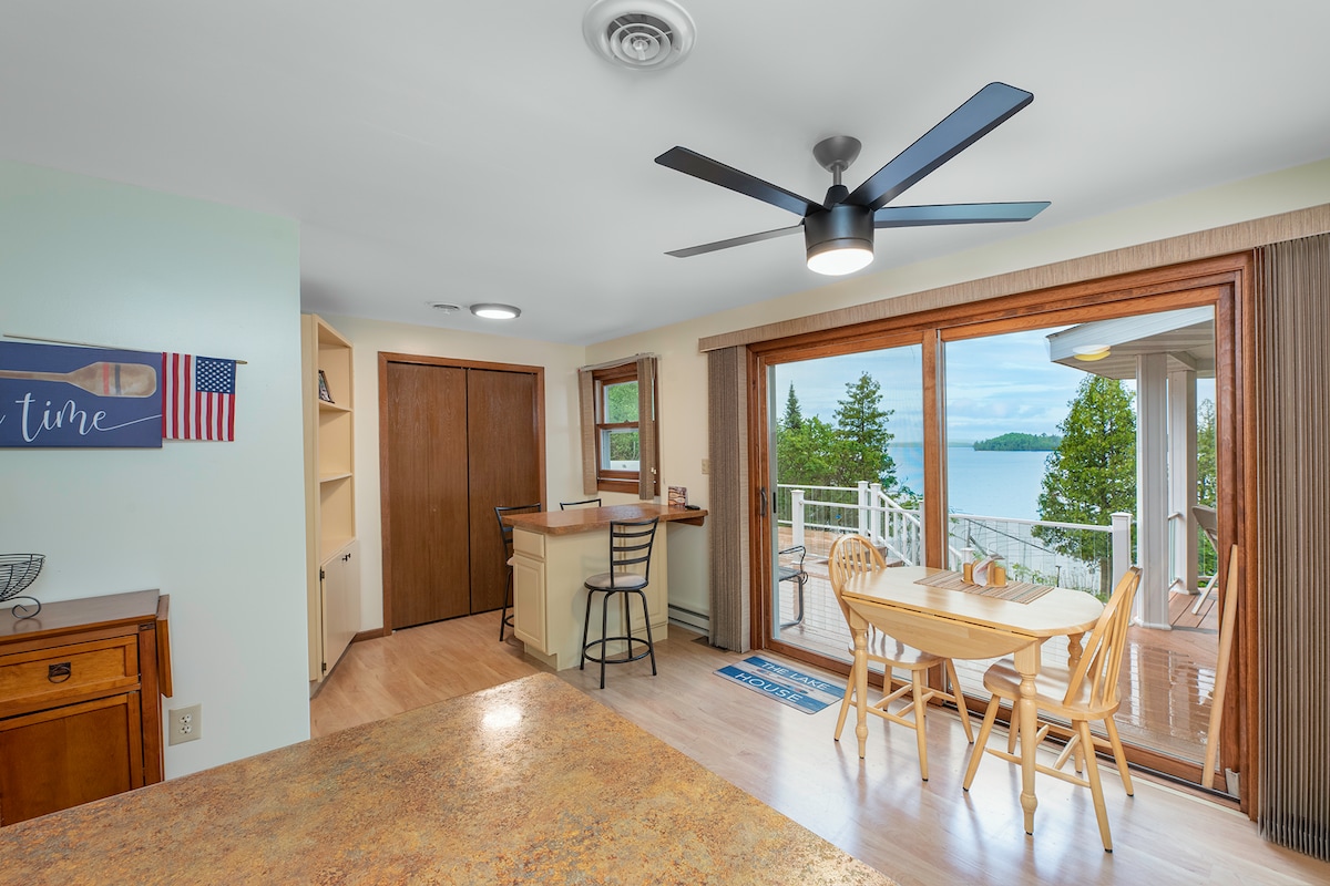 Is teach saoire a spreagann hygge é an Teach Oighir ina bhfuil saoráidí ar cíos ar scála mór. Tá ár dteach athchóirithe as an nua le 100 troigh de éadan príobháideach ar Loch álainn Oighir. Samhlaigh do chupán caife ar maidin ar dheic an phríomhsheomra leapa le radhairc lánléargais ar an loch. I measc na saoráidí ar scála níos mó tá cuntair eibhir, 4 theilifís chliste, agus bailchríocha cosúil le spá i 3 sheomra folctha. Tá an Teach Oighir suite go lárnach in Iron River gar do Ski Brule agus gníomhaíochtaí eile lasmuigh a bhaineann taitneamh as i gContae álainn Iarainn.