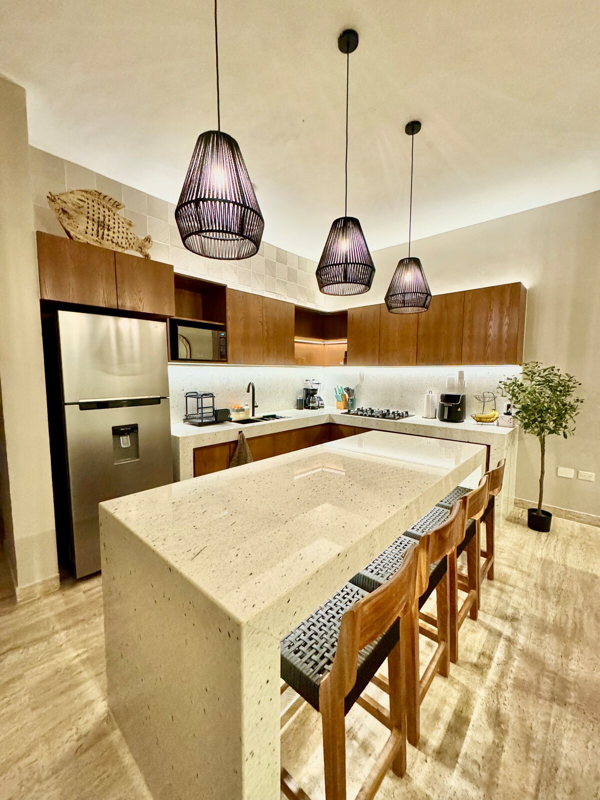 Fáilte go dtí ár villa cois trá Casa Kyma in San Crisanto (50 nóiméad ó Merida, Yucatan, Meicsiceo). Beidh an villa iomlán 3 sheomra leapa agat le radhairc ar an aigéan agus solas na gréine dodhearmadta. Tá gach spás deartha go cúramach i stíl le haghaidh d'fhanachta speisialta. Is féidir leis an villa freastal ar 6 dhuine fásta, agus páistí ag roinnt leapa lena dtuismitheoirí gan aon táille bhreise. Taobh istigh den villa, tá cistin lánfheistithe, agus lasmuigh, tá láthair beárbaiciú ann le haghaidh greadadh taitneamhach lasmuigh.