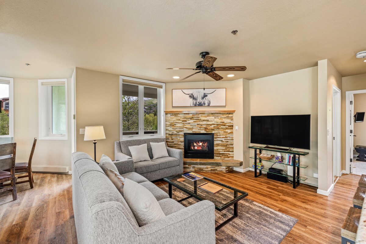 Ski condo only 5 minutes ride to ski mountain on free bus at condo complex and short drive to downtown. Hot tub out back door! King bed in private bedroom. Updated bathroom 2025 and new flooring throughout condo. -Full size, well stocked kitchen with regular & Keurig Coffee -Living room with New Gas Fireplace, leather reclining sofa, 50 inch TV, high spd WiFi, cable and streaming (Netflix, Amazon Prime, HBO Max). -Washer/Dryer in unit -Free Bus Stop: short walk from condo door -Ski Locker